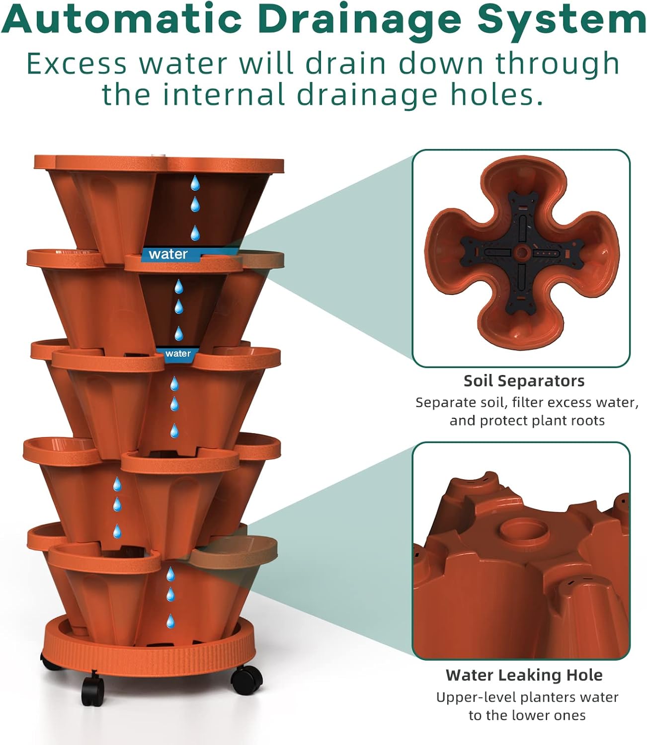 - Flow Design - The water filtration system from top to bottom can save water and retain moisture but prevents overwatering or root rot. 5 filters are placed on each level to keep the soil from going through the big drainage holes, it also helps retain water in each planter level.