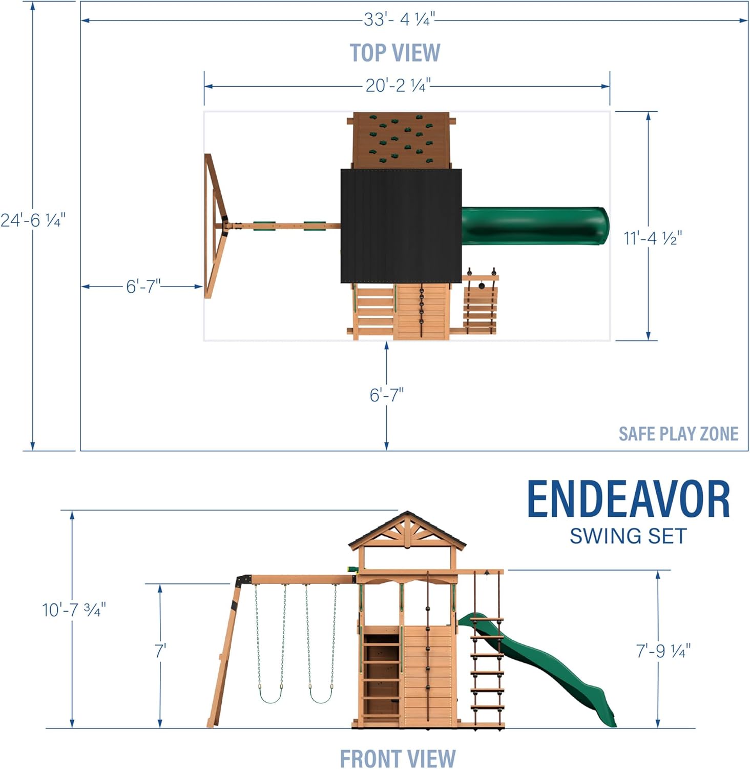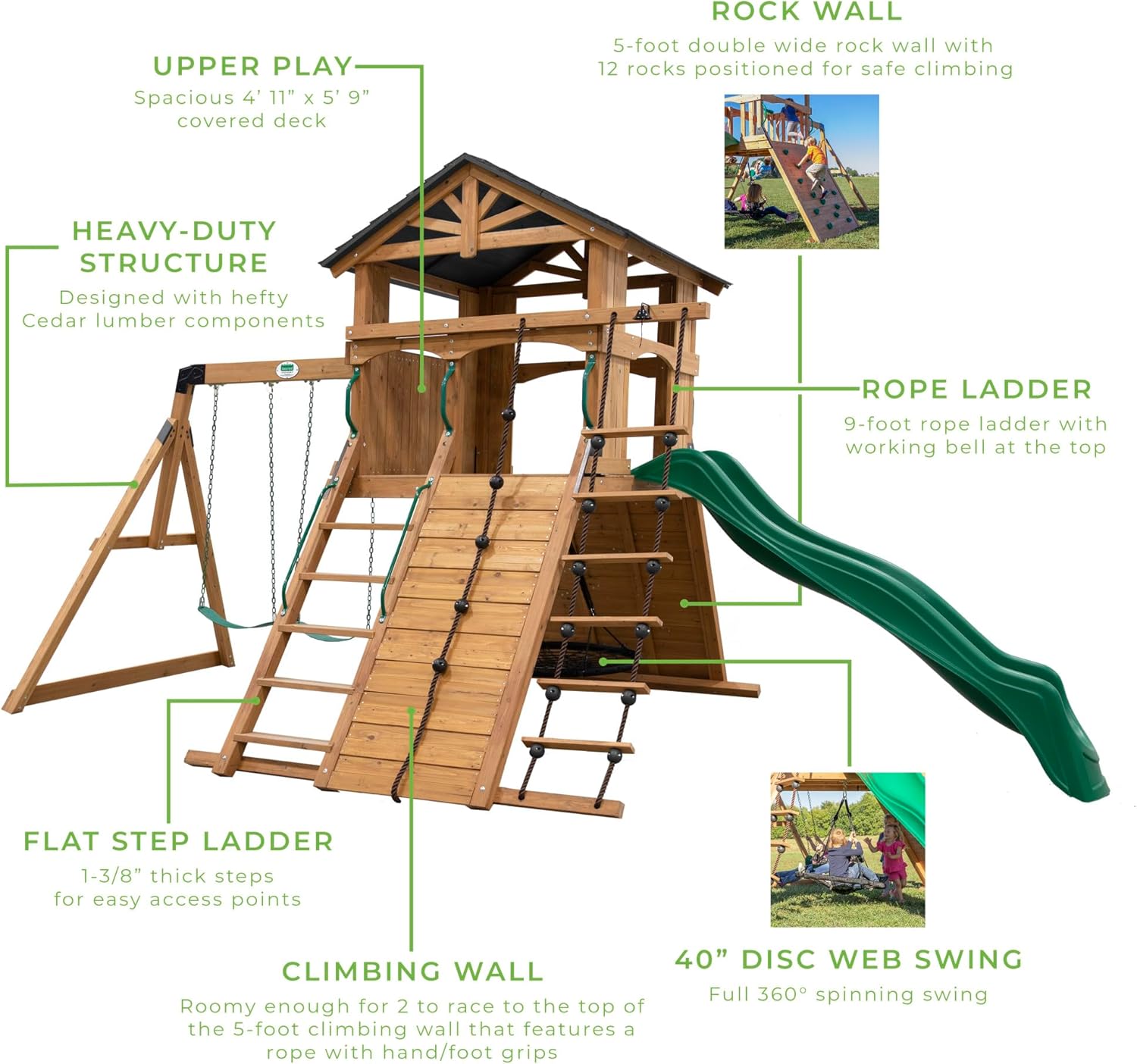 Backyard Discovery Endeavor All Cedar Wood Swing Set Playset for Backyard with Large Clubhouse Wave Slide Rope Ladder Rock Climbing Wall Wave Slide 2 Belt Swings and 1 Web Swing Gift for Ages 3-10