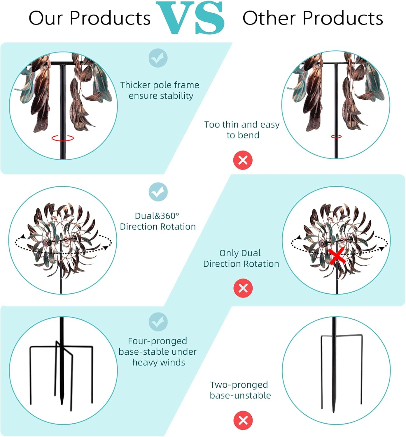 - Flexible Rotate: Metal wind sculptures having double sides blade can spin independently smoothly on sealed bearings, through reversible dual ball bearings, the pair of blades spin in opposite directions simultaneously. Waterproof wind spinner with the durable paint on the blades surface, can withstand most weather conditions