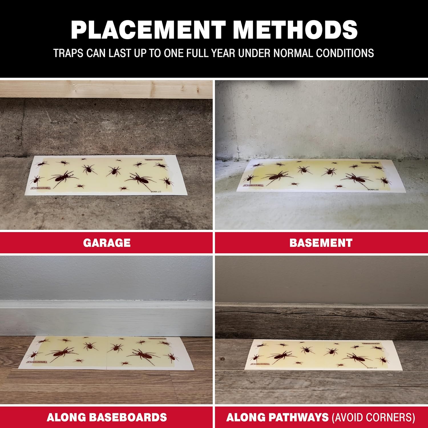 - YEAR-ROUND CONTROL: Catchmaster glue traps for Brown Recluse Spiders are pesticide-free and mess-free. This spider and bug catcher is an effective and easy solution for spider problems. When placed in an area with normal conditions, the spider catcher can last up to one full year.