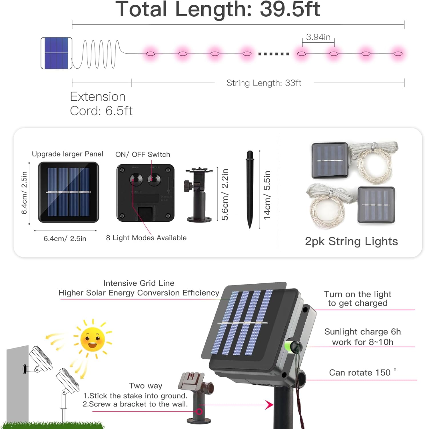 - 🎀2 PACK & SIZE: SUDDUS solar outdoor valentine lights come with 2 packs of string lights. Each string is 33 feet long with 100 led bulbs 3.94 inches spaced apart. Two strings' total length is 66 feet. The extension cord is 6.6-feet between the panel and the first bulb.