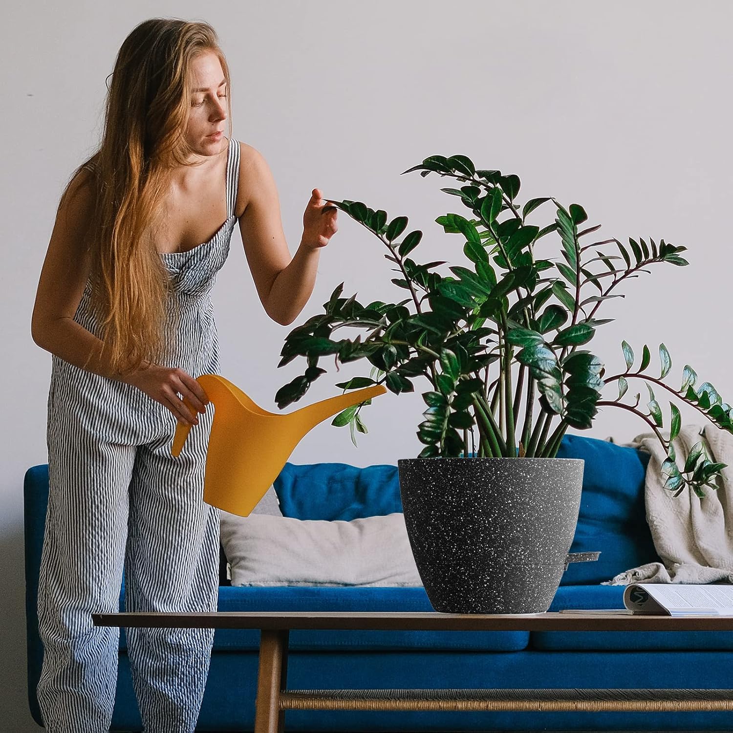 - Modern Design: Matte black finish and round shape highlight plant foliage.