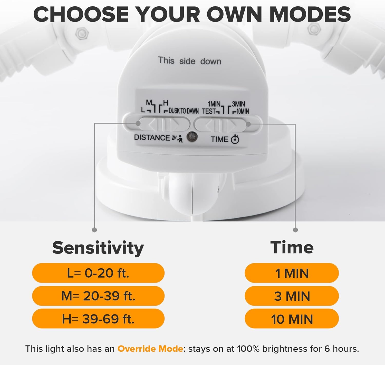 - 4 LIGHTING MODES: Test Mode, Security Mode, Dusk to Dawn Mode and Manual Override Mode. Manual override mode allows light to operate constantly for selected period of time. Deactivates during daylight hours. More choices can meet different demands for each customer. Choose the most appropriate mode for your needs.