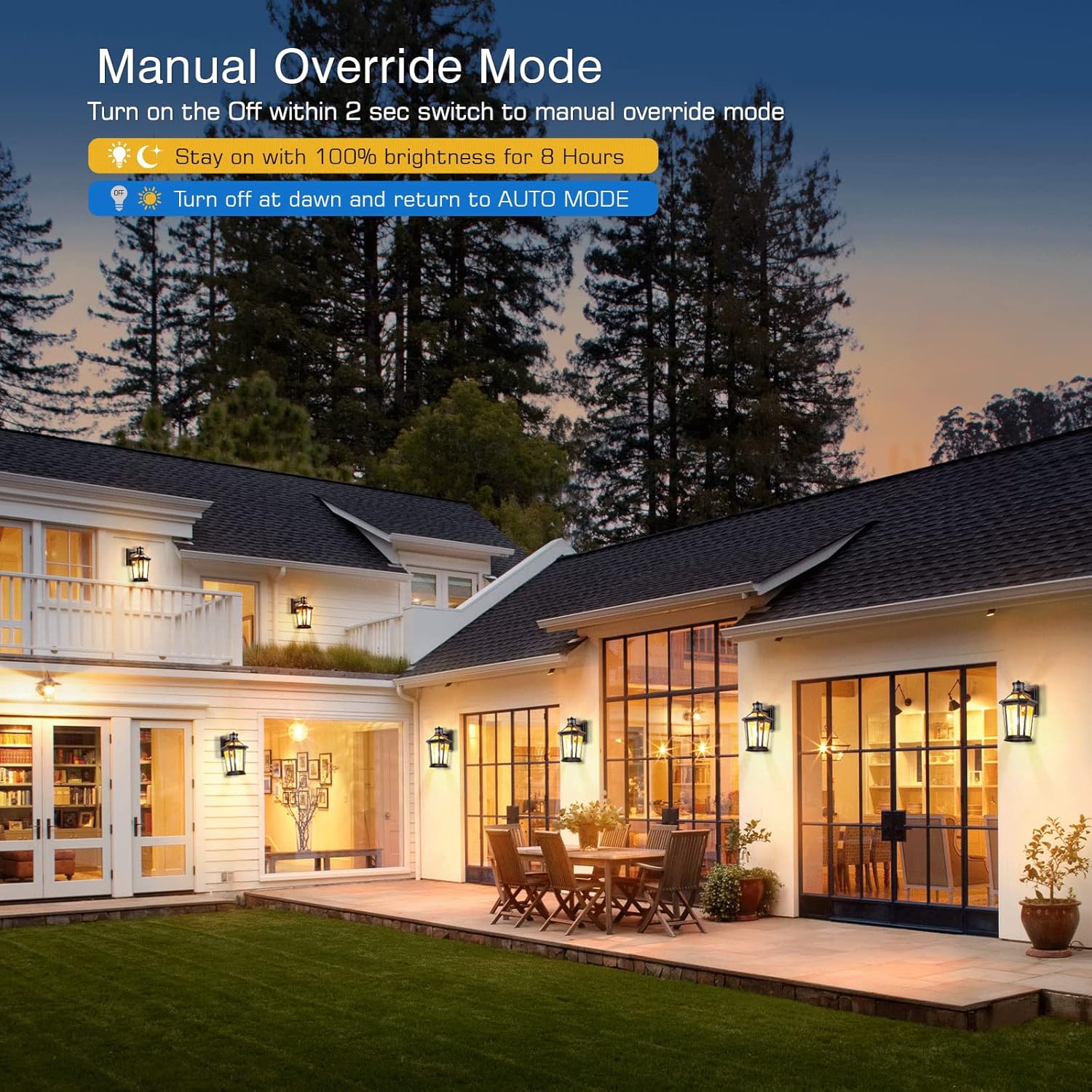 - π[ One-button Mode Switching ] Our outdoor light fixture integrate a mode-switching button. Just press the sensor button, You can easily switch to ECO or DIM mode at any time, The exterior lighting fixtures will remember your last setting. You can switch the working mode at any time with a simple press, without the need for complicated learning or professional electricians. Free your hands with new sensors tech and effectively save energy.