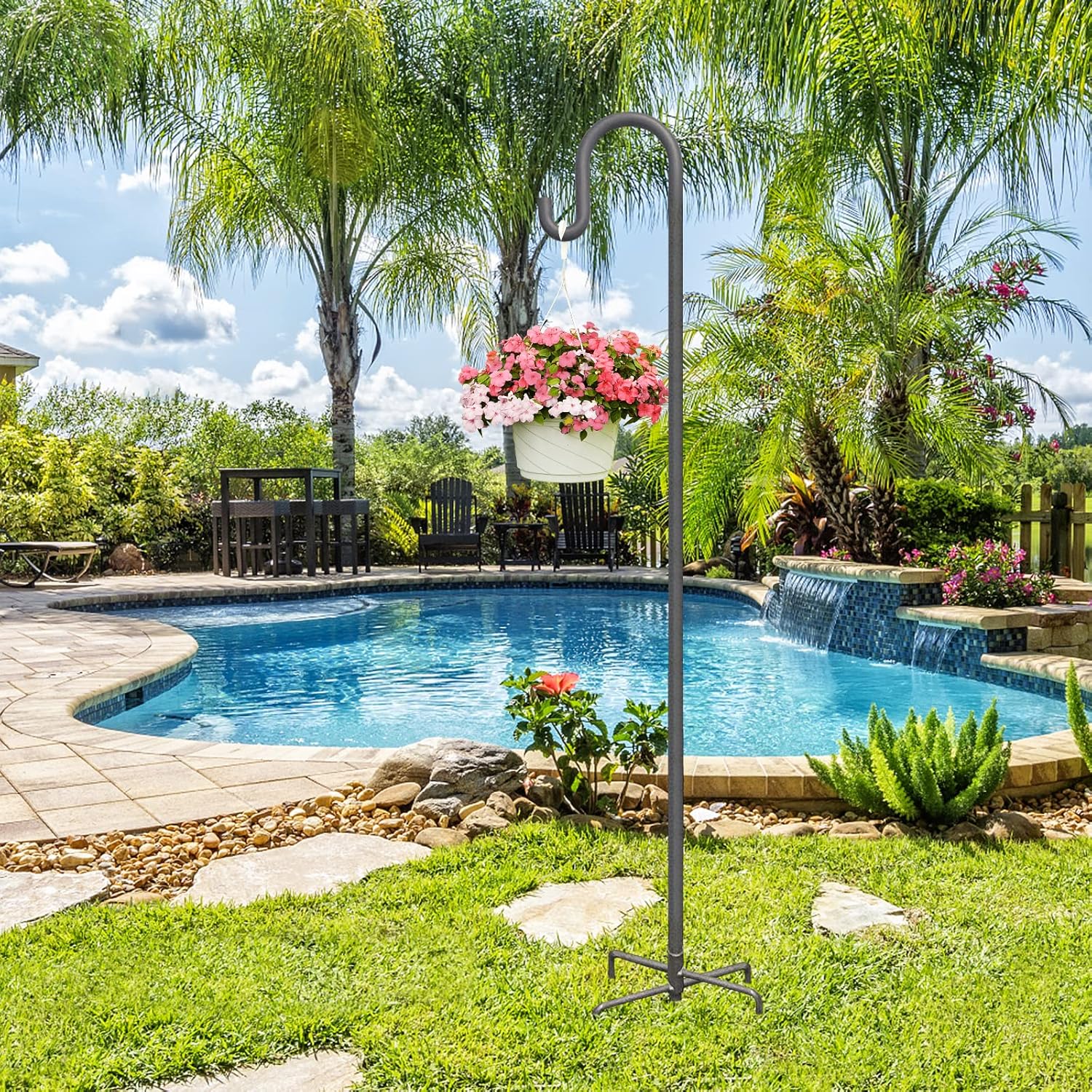 - 【Multipurpose Bird Feeder Hook for Outside】This shepherd hook is perfect for hanging almost anything you want in the garden or patio, such as hummingbird feeders, birdhouses, solar lights, lanterns, wind chimes, small flower baskets, succulents, wedding decorations.