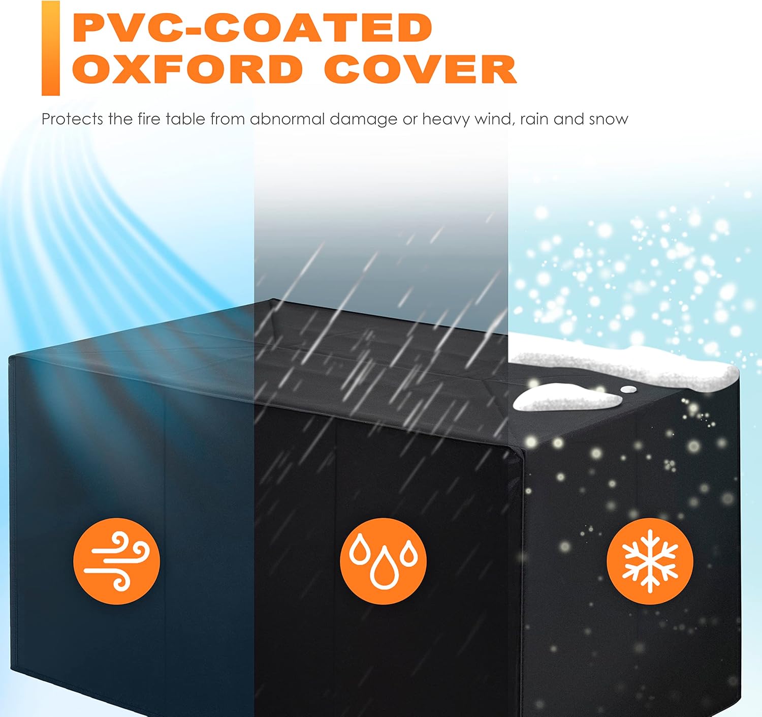 - PVC-COATED OXFORD COVER: Use the matching oxford cover when the fire table is not in use. This fabric is famous for its windproof, water-resistant performance, protecting the product from abnormal damage from heavy rain and excessive sunshine