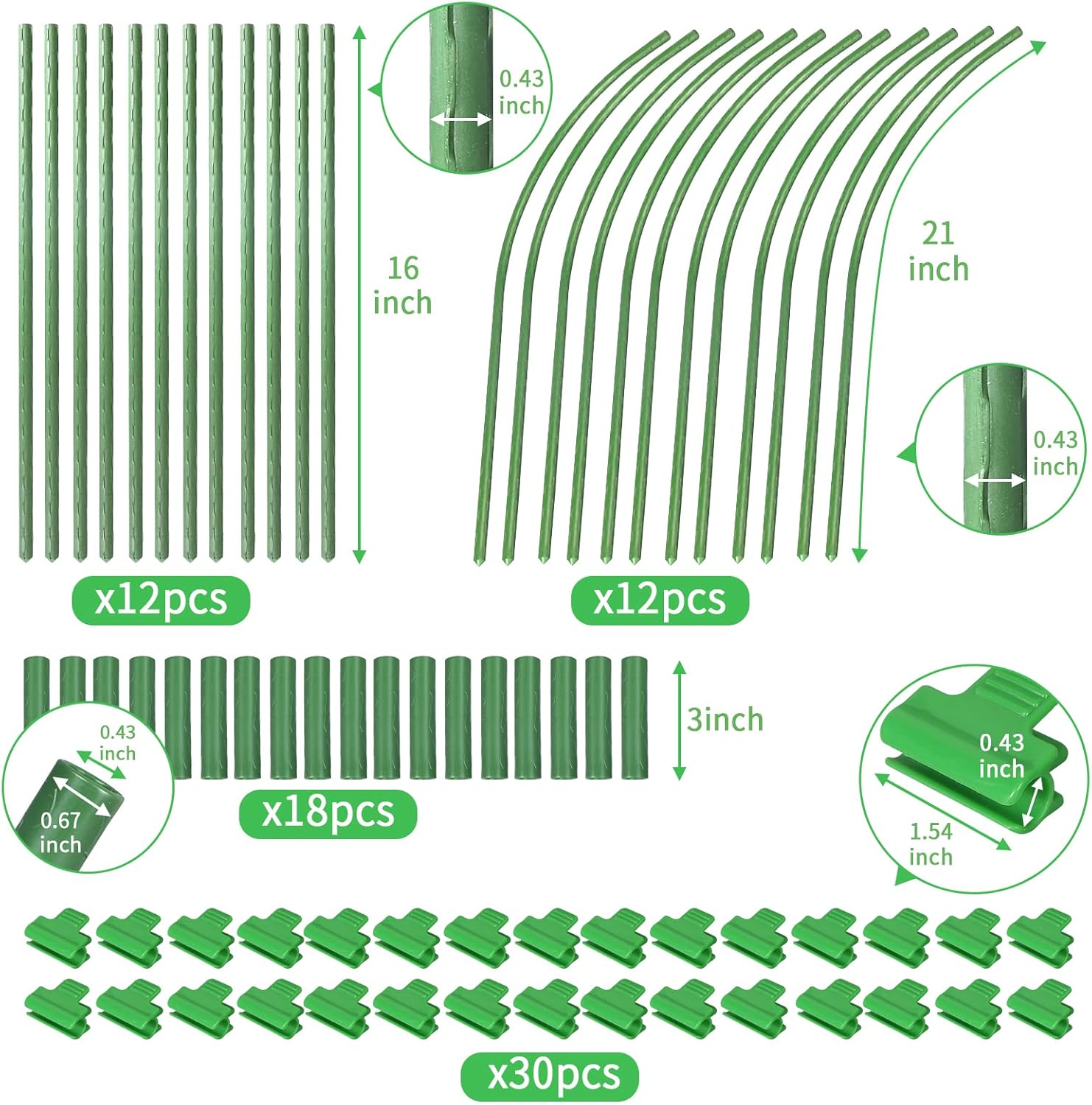 - Package: Include 12 half-curved tubes, 18 pcs cylindrical connecting pipes and 12 pcs 40-inch garden stakes (a total of 6 sets of greenhouse hoops), and 30 plastic clips.