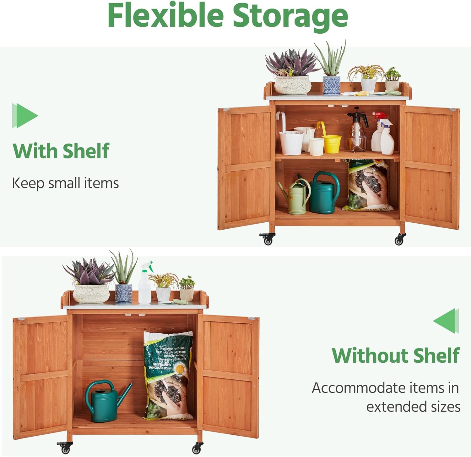 - Large Space Storage: This storage garden potting bench for horticulture features 3 tiers of shelves, providing ample storage space, ideal for long-handled garden tools, small lawn care equipment, watering cans, shovels, flower pots, and more