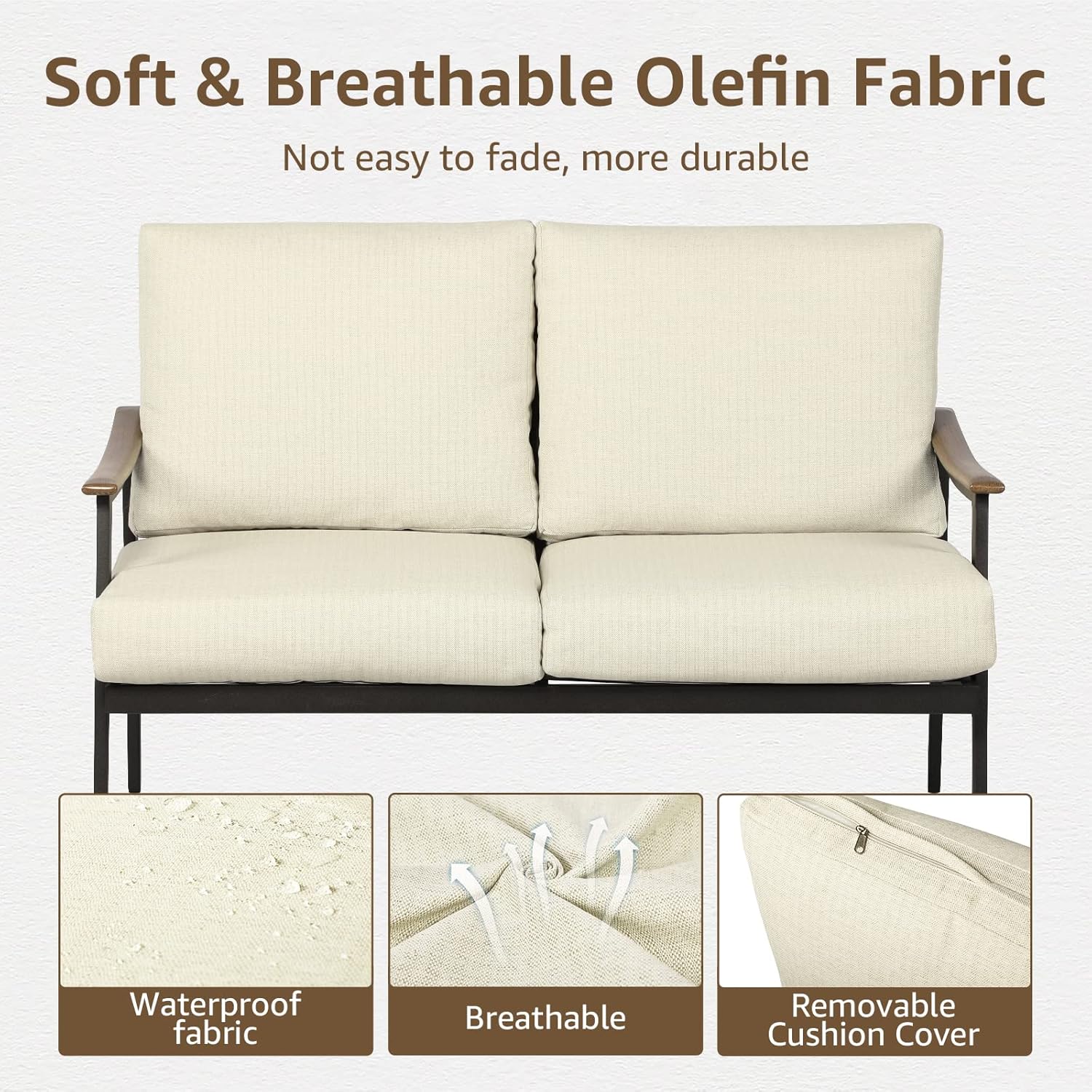 - ăPremium Olefin Fabric & Removable Cushion CoverăThis metal outdoor furniture sofa features soft Olefin fabirc, which is more comfortable and breathable than ordinary polyester fabric, more resistant to fading,better UV-resistant.The cushions covers are waterproof, and the water drops on the surface can be wiped off with a paper towel, and they have zippers, easy be removed for washing