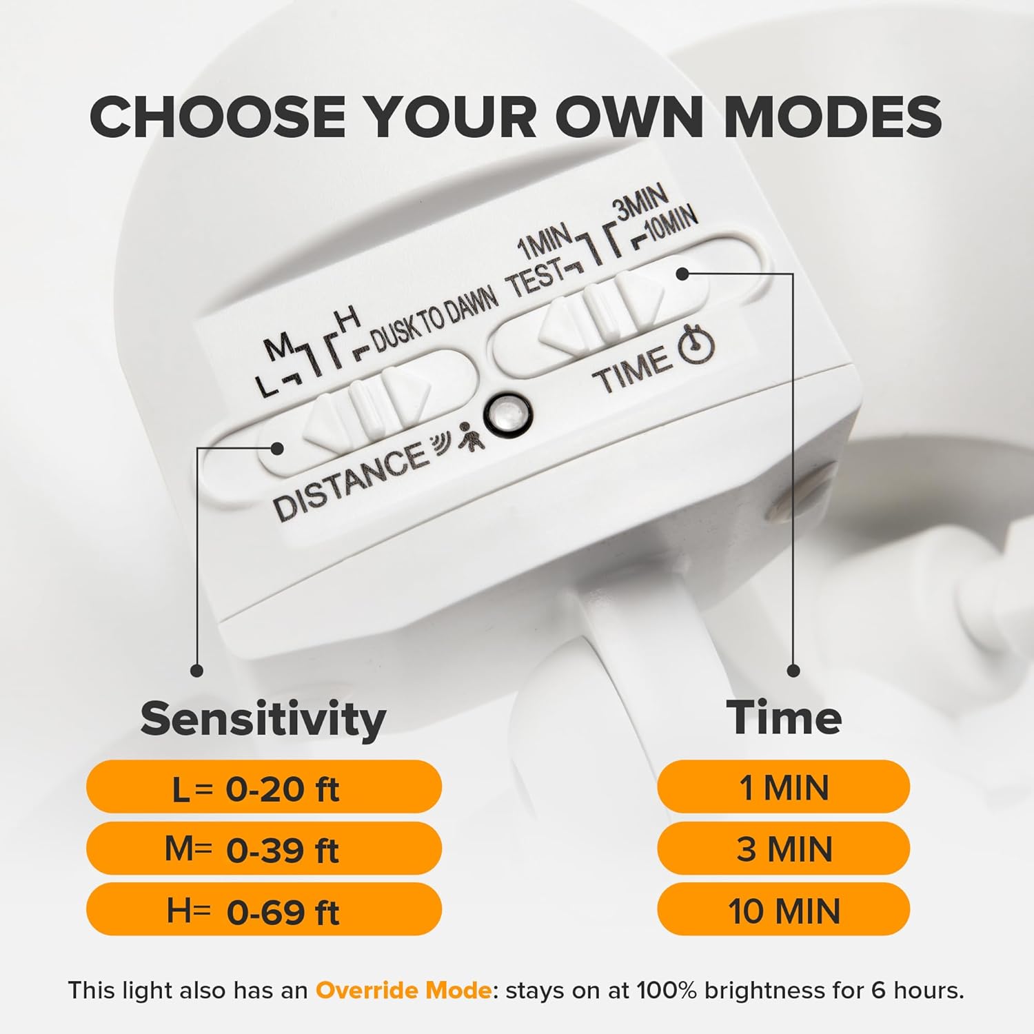 - 4 Lighting Modes: Test Mode, Security Mode, Dusk to Dawn Mode and Manual Override Mode. Manual override mode allows light to operate constantly for selected period of time. More choices can meet different demand for each customer. Choose the most appropriate mode for your needs and desires