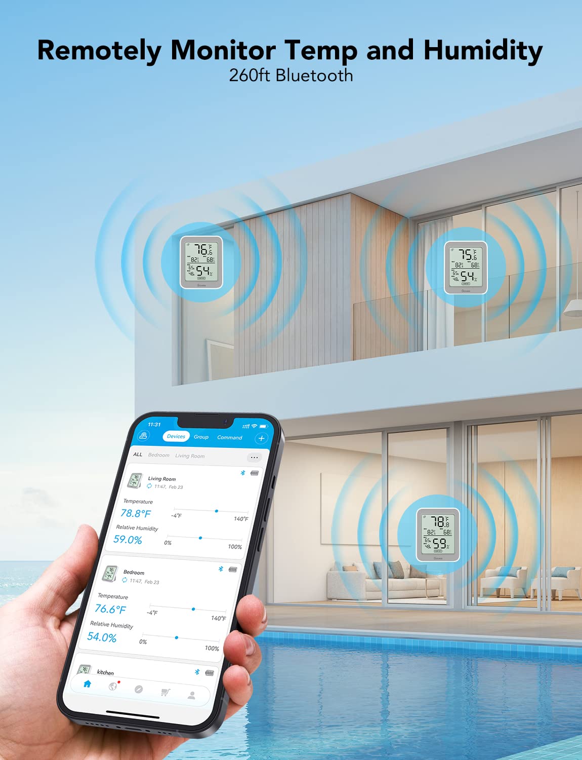 - Easy to Use: Download the Govee Home app, search for and select H5075, and pair the room thermometer hygrometer successfully in one minute. With a 196ft/60m Bluetooth range, you'll be notified of any temperature humidity changes immediately.