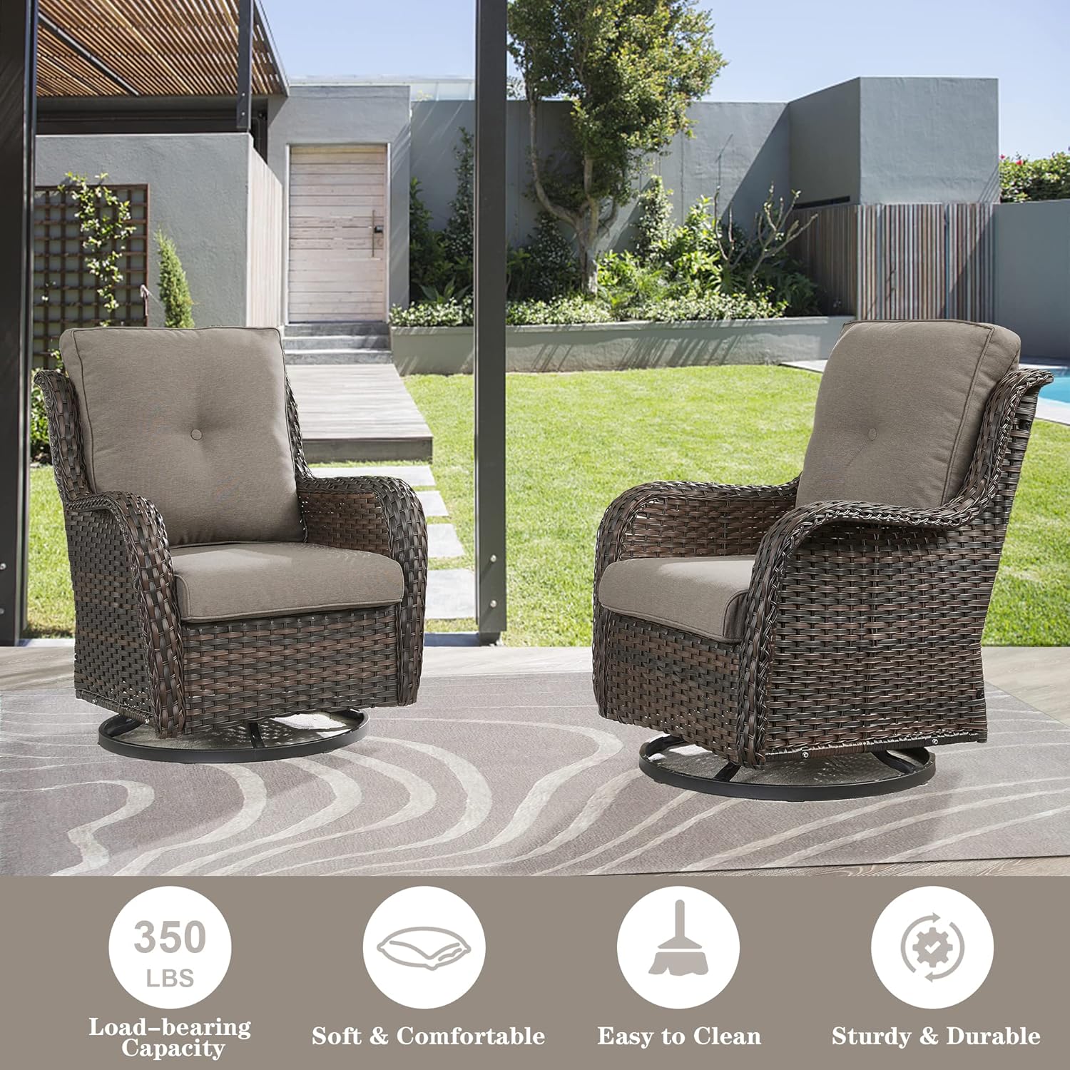 - Patio Furniture Set Introduction: The four-piece patio furniture set includes 2 swivel glider chairs and 2 ottoman, ottoman can not only be used to relax your legs, but also can be used as a small table or small stool. The swivel chairs can hold up to 350 pounds.