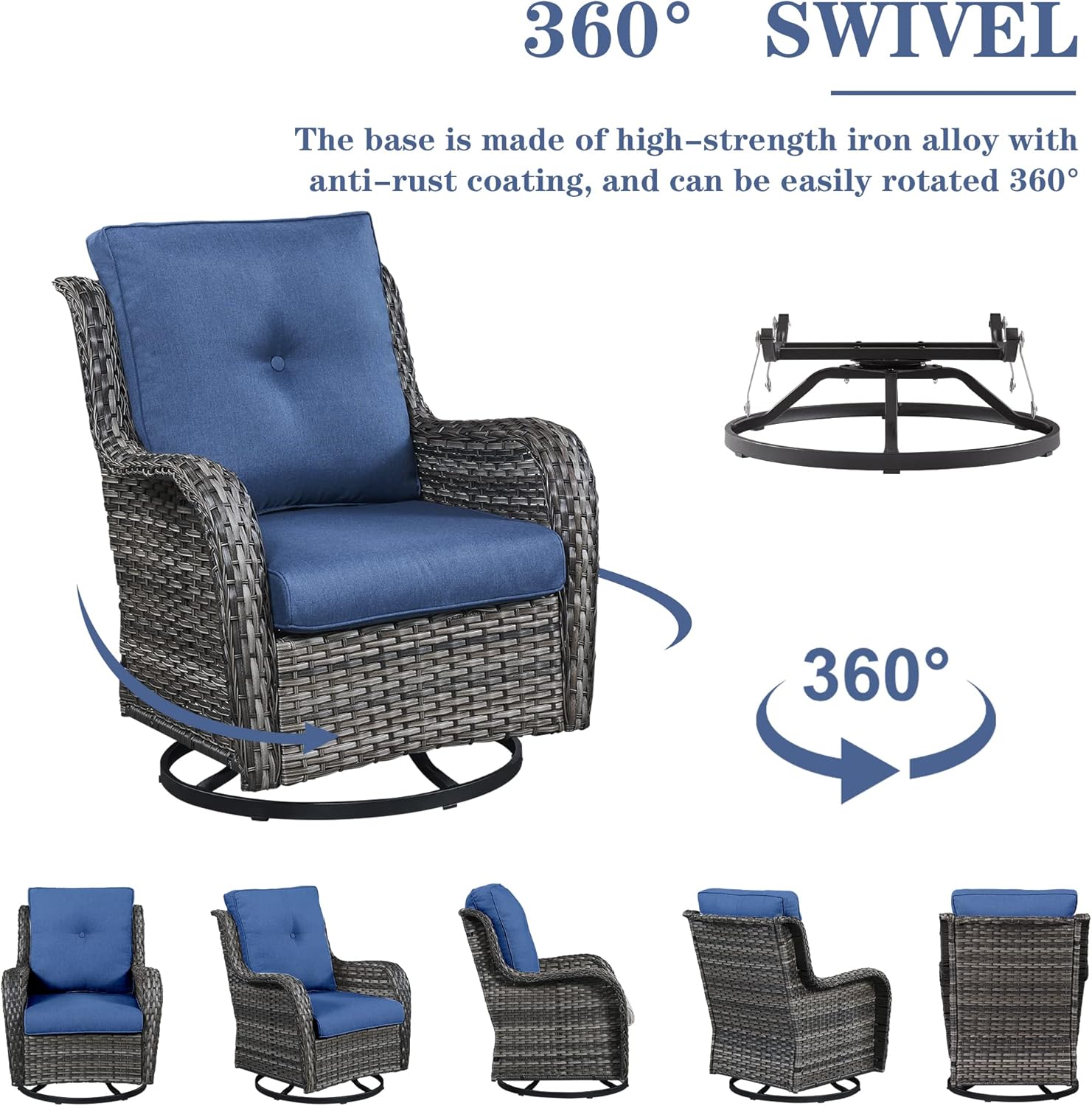 - Patio Furniture Set Introduction: The 5-piece patio furniture set includes 2 swivel glider chairs, 2 ottoman and a loveseat, ottoman can not only be used to relax your legs, but also can be used as a small table or small stool. The swivel chairs can hold up to 350 pounds.