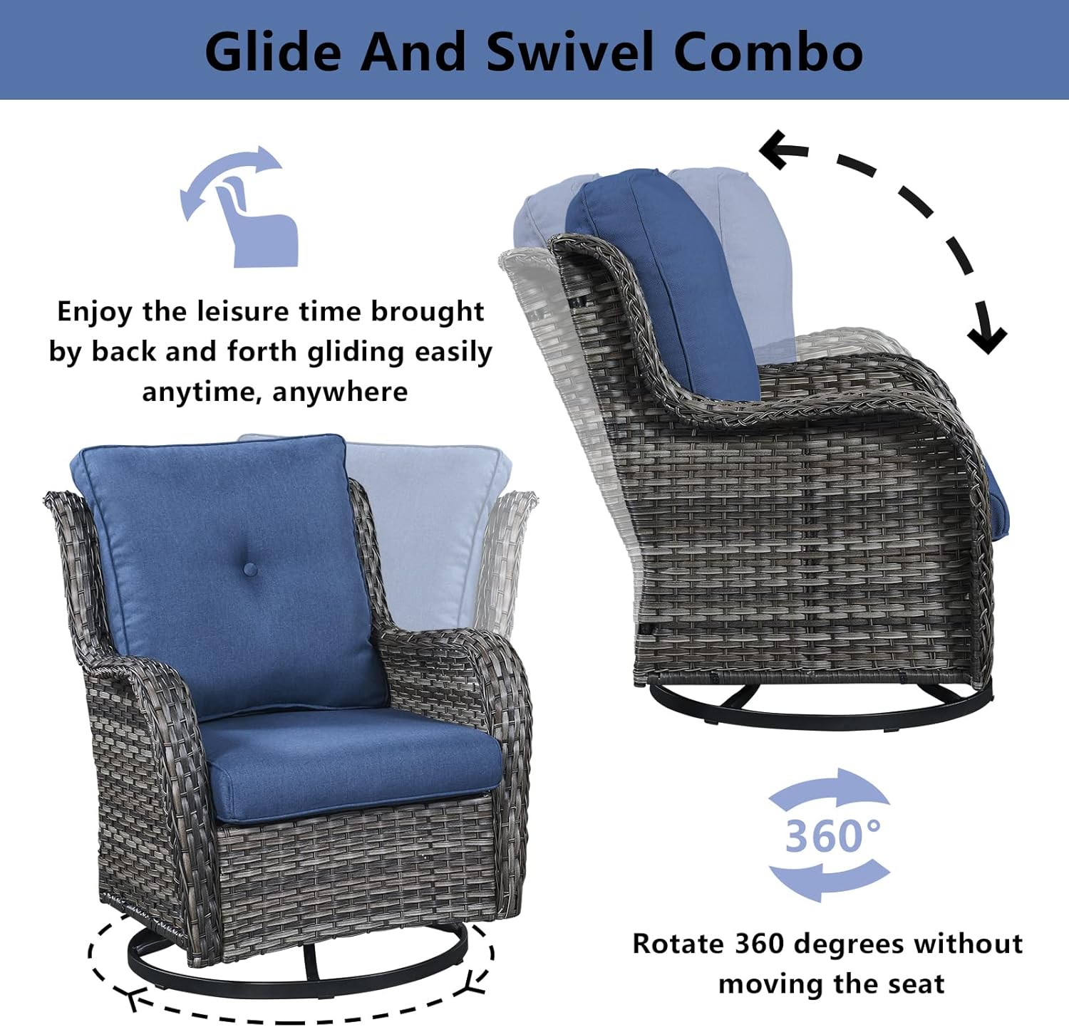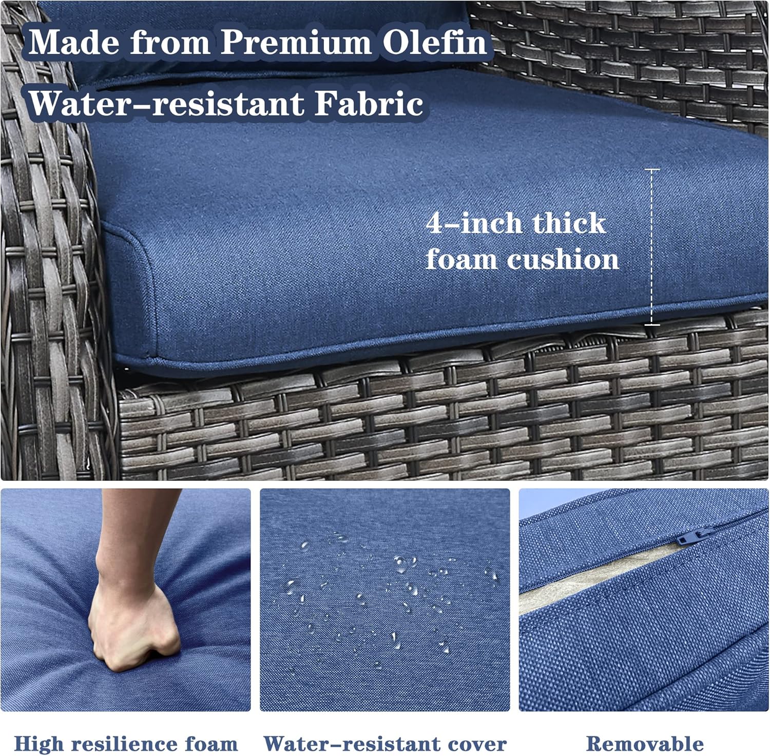 - Comfortable And Easy To Clean: Each glider chair and sofa in this outdoor set comes with a 4-inch thick foam seat cushion and an 8-inch thick cotton back cushion, which is ergonomic and enhances the overall comfort of the chair. The chair cushion cover is made of outdoor professional olefin fabric which is water resistant, and the seat cushion is equipped with zippers that are removable and easy to clean.