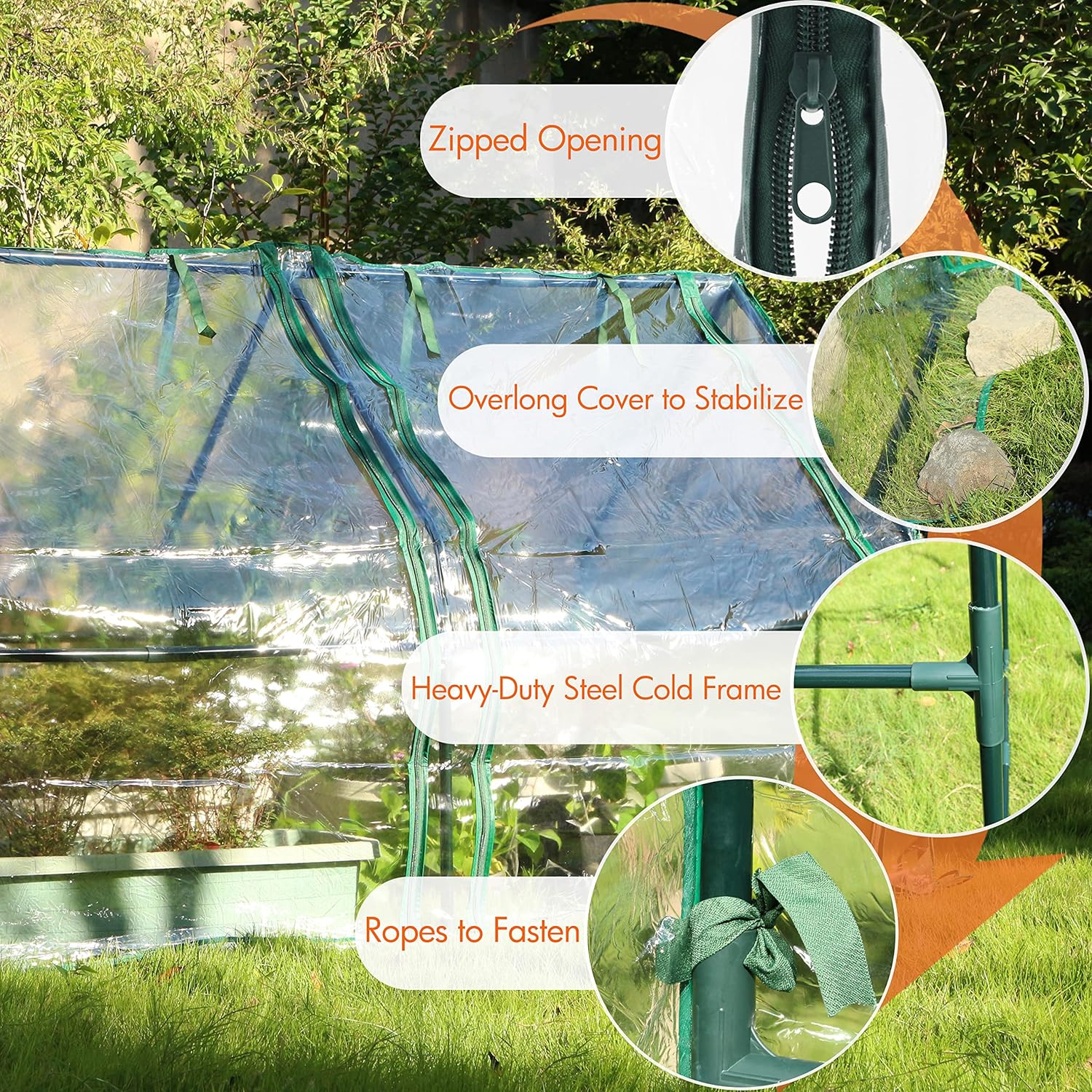 - PVC Cover - The PVC thick cover allows your plants to absorb sunlight for keeping warm and photosynthesis. It is waterproof, UV and weather resistant, providing special temperature and other growing condition for plants.