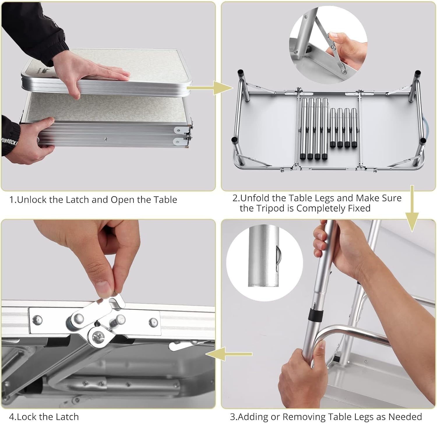 - High Quality Material, Sturdy and Durable: The entire frame of portable table is made of thicker aluminum alloy, which is very solid and durable. MDF (Medium Density Fiberboard) tabletop is smooth and easy to clean. You can easily remove stains by simply wiping with a damp paper towel