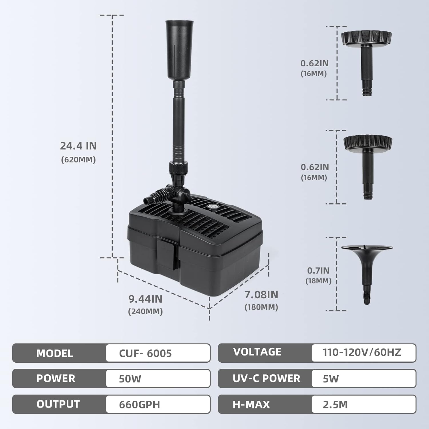- What You Get? One 660GPH pond filter pump, three fountain heads and one user manual. ANBULL pond filtration kit will not only keep this pond water clean but add a great deal of character to your pond!