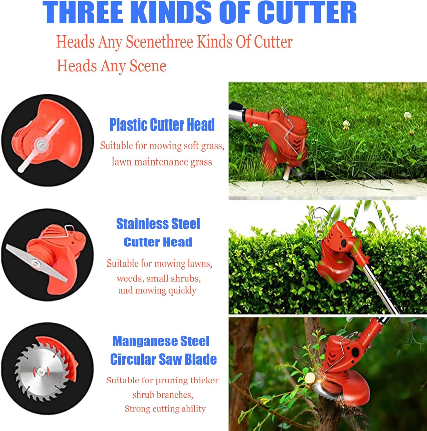 - 【Powerful Cordless Electric Weed】:Cordless electric weed wacker with 850W high power pure copper motor. 18000 rpm no-load speed(6000 rpm work speed), achieve large operations under small machines.The Grass Trimmer battery powered is multiple functions in one: grass trimmer, edger, lawn mower, easy for different cutting jobs, not limited by wires, you can mow anywhere. Foldable design, which can further reduce the occupied space and make it more convenient to move and store!