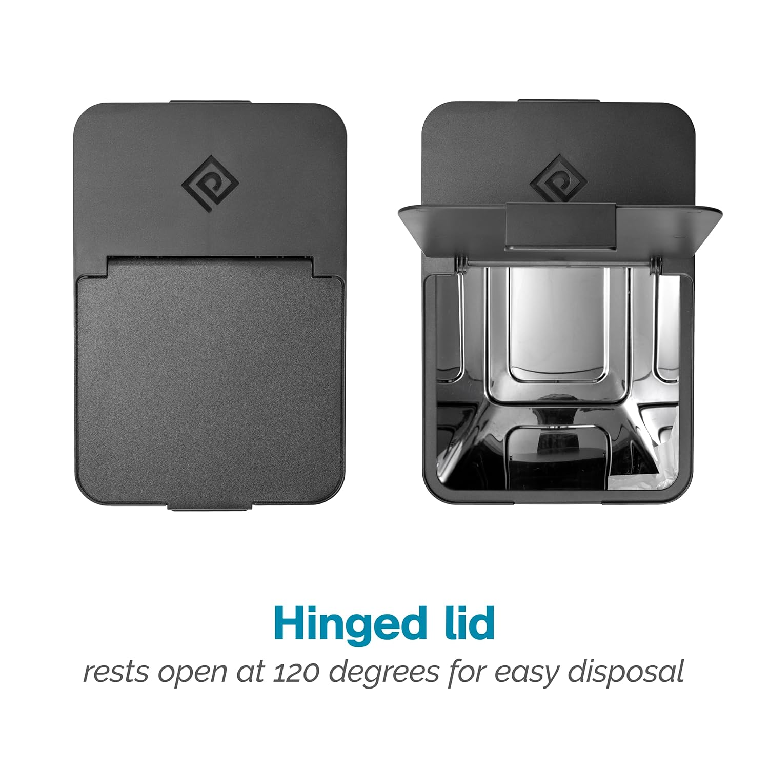 - REMOVABLE HINGED-LID rests open at 120 degrees for easy disposal