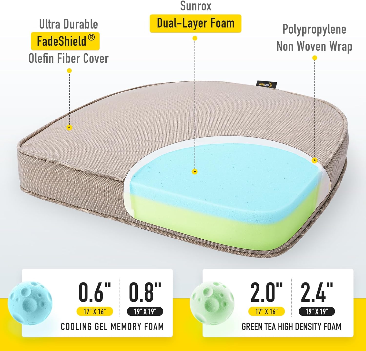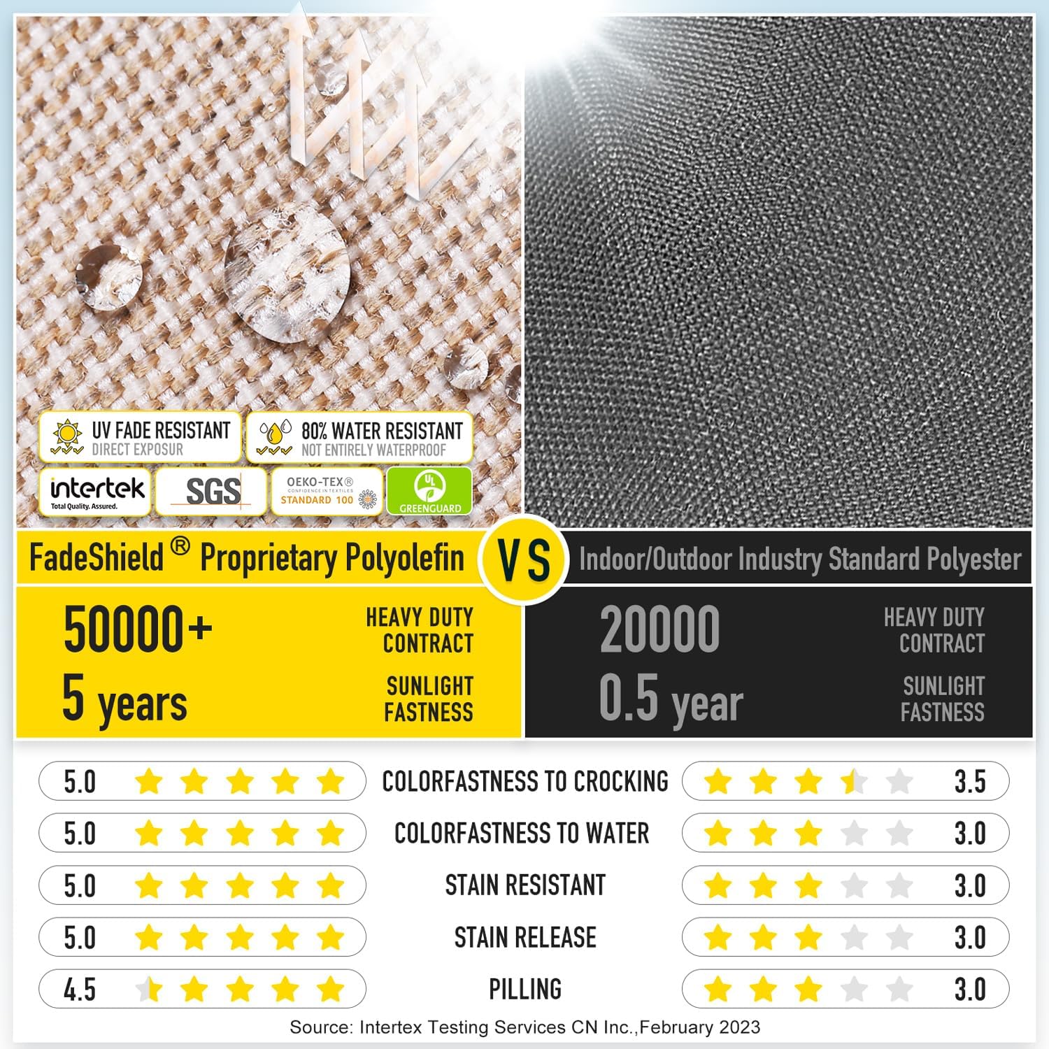 - 【FadeShield - UV Fade Resistant】FadeShield Proprietary Polyolefin are dependable indoor/outdoor performance fabrics, they are infused with antimiсrоbial silver Ion technology and can withstand 5 years of UV fade resistance, solution-dyed to make sure that each color is deeply ingrained in every fiber for continued vibrancy, even after heavy use. We recommend bringing it indoors when it rains or when not in use to preserve its lifespan and keep it looking beautiful.