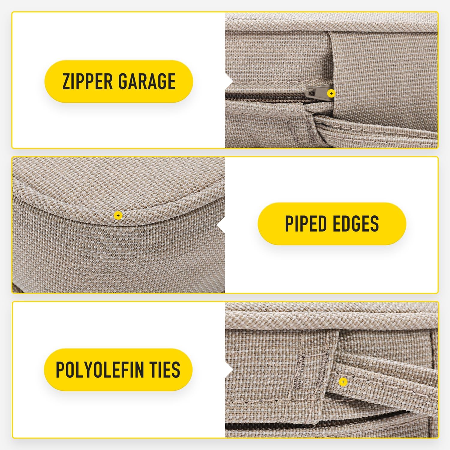 - 【Invisible Zipper Garage | Removable Cover with Ties】Zippers lock to keep a tight closure, stored in protective garages to prevent scratching your patio furniture when closed and offer a seamless look. Removable cover with non slip ties, customizable fit to keep your cushion where you want it.