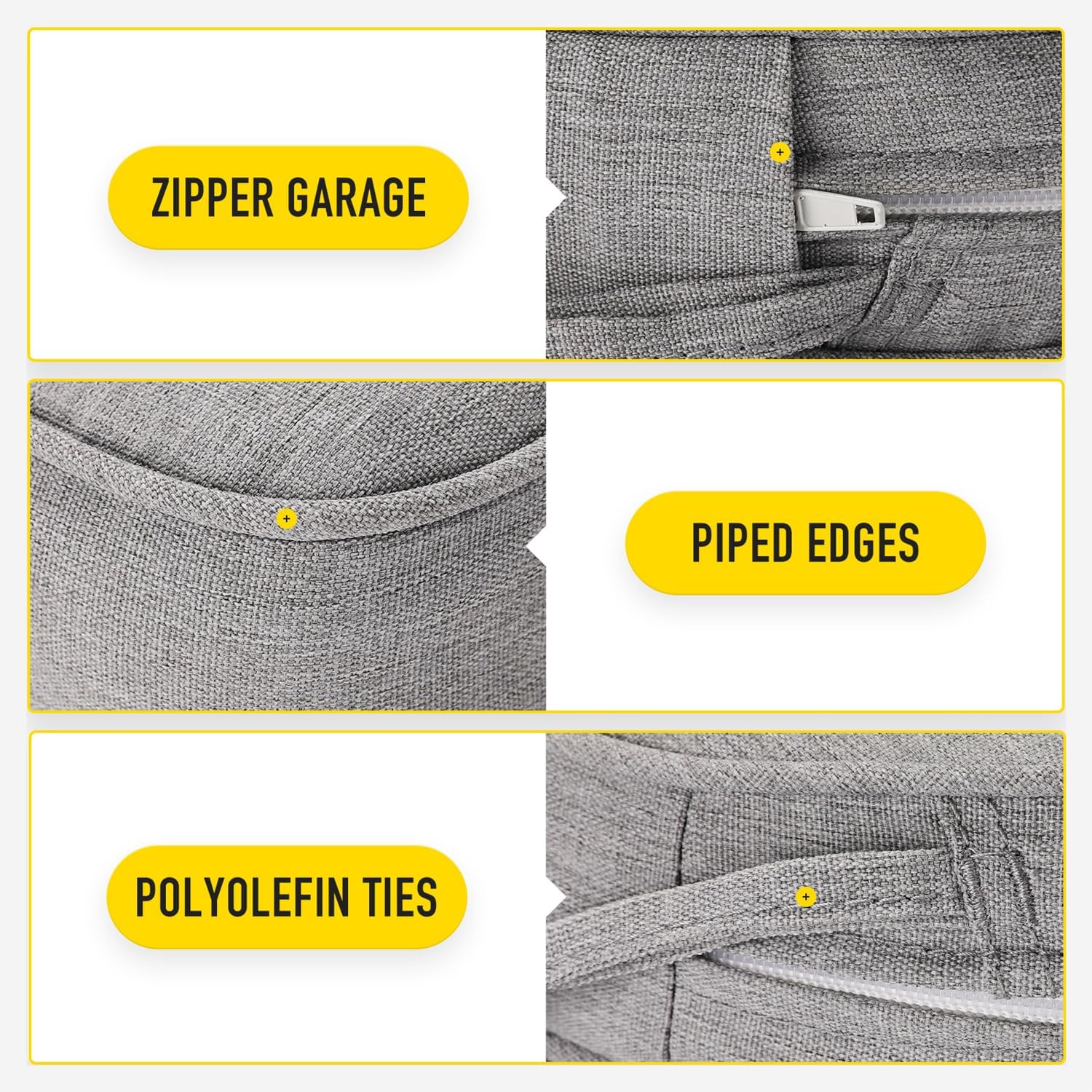 - 【Invisible Zipper Garage | Removable Cover with Ties】Zippers lock to keep a tight closure, stored in protective garages to prevent scratching your patio furniture when closed and offer a seamless look. Removable cover with non slip ties, customizable fit to keep your cushion where you want it.