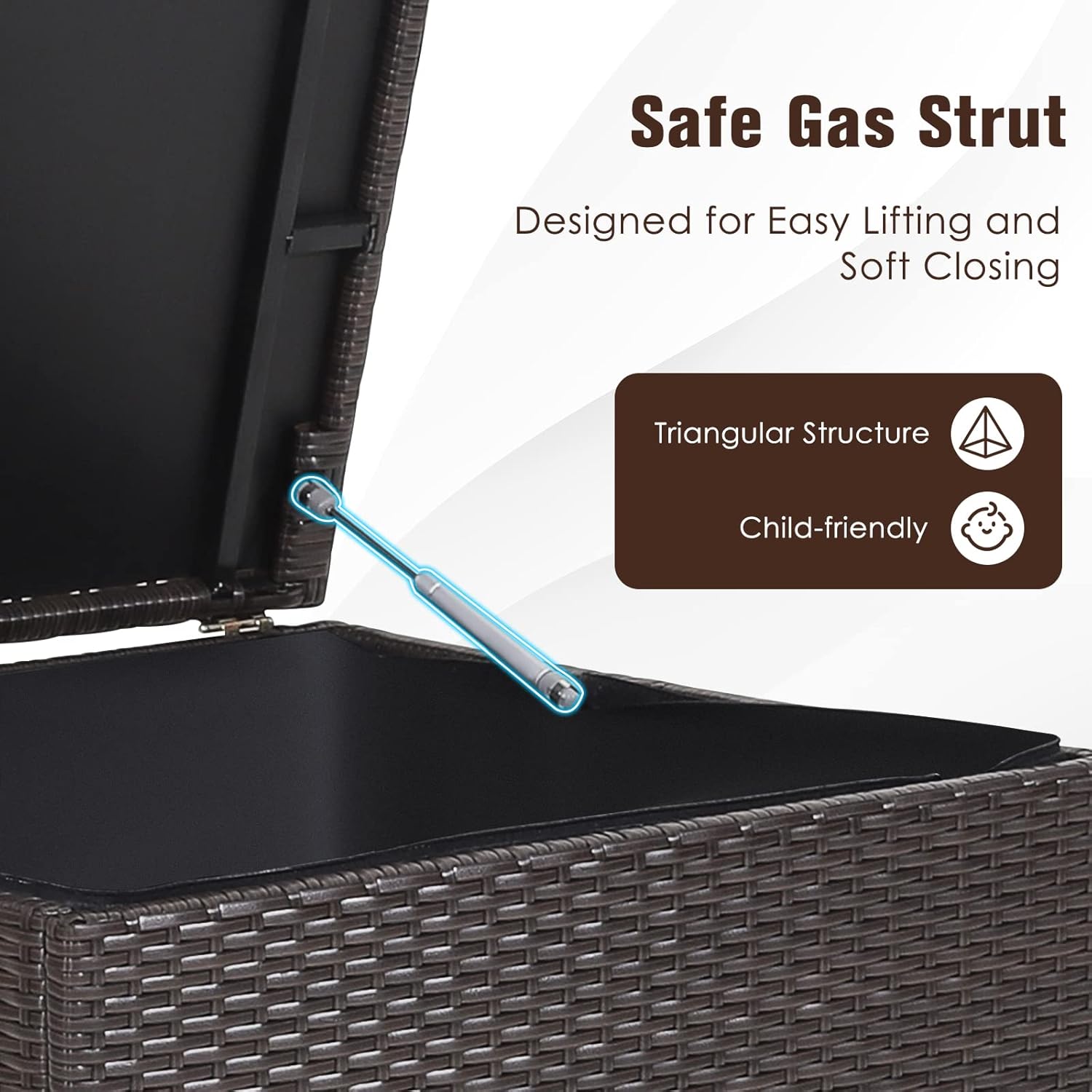 - Waterproof Liner: This deck box is equipped with waterproof liner to protect your items from rain and dust. It can be zippered up for all-round protection. And then, the safe pneumatic rod with triangular structure is designed for soft closing and easy lifting.