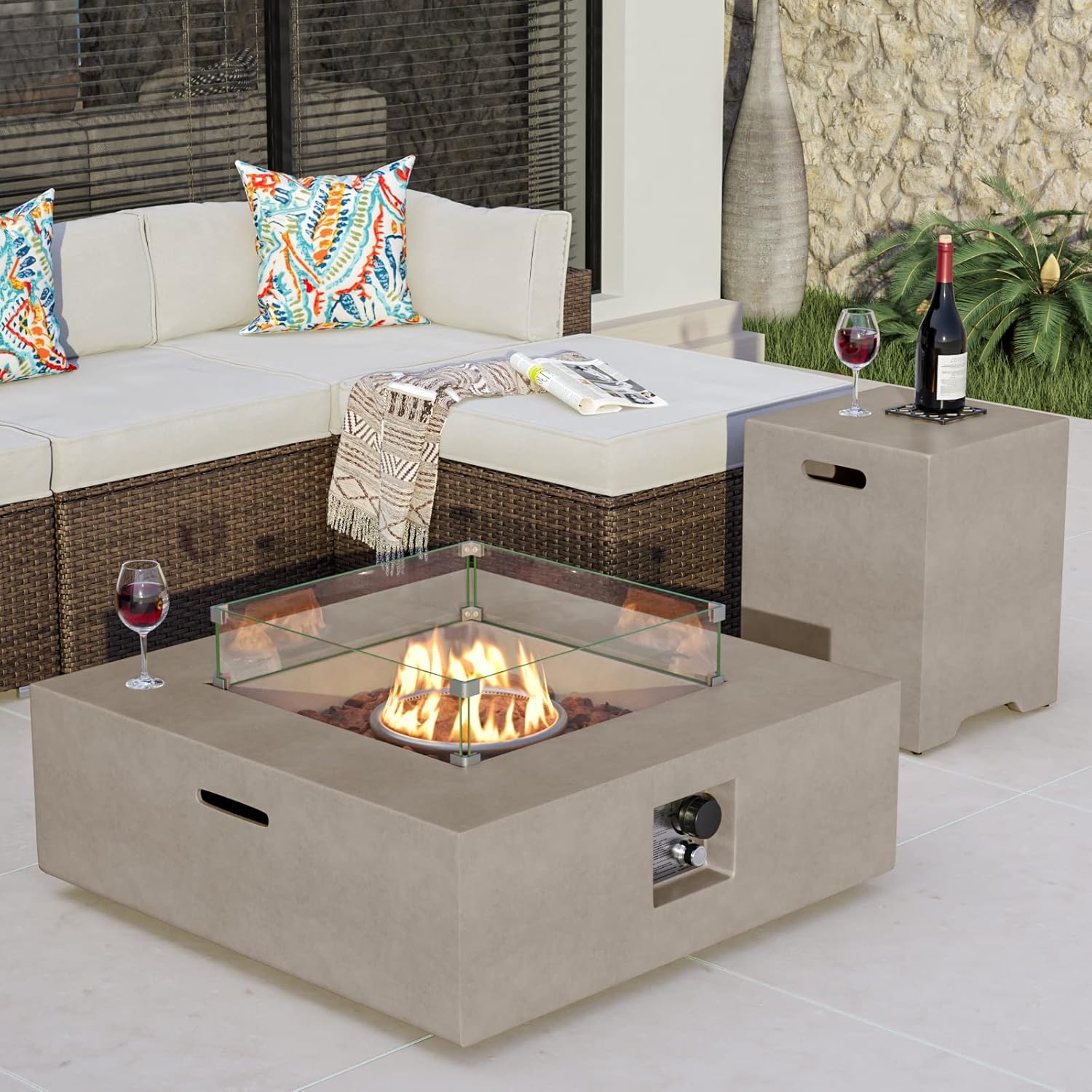 - 🔥 【Fashion Forward Flames】: The ultramodern Gray faux stone appearance is something you'd expect to see in a chic SOHO loft space or art opening with it's simple, unobtrusive cubist style. All built to last from sturdy, fire retardant magnesium oxide with a stainless steel burner bowl. Lights with the push of a button and the flame intensity is controlled by the adjustment knob.