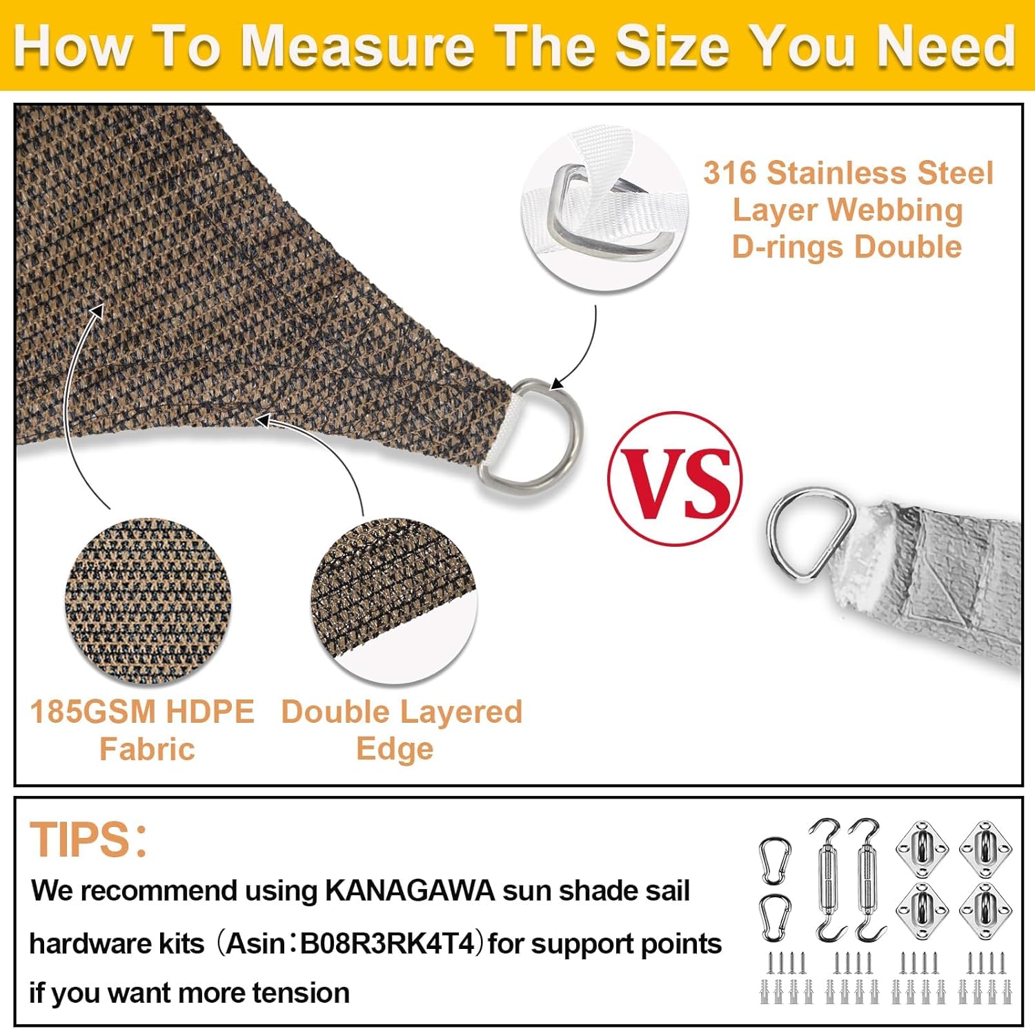 - High Quality Materials: Made of 100% brand new 185 GSM HDPE (high density polyethylene) material.Our sunshade sail is attached with DOUBLE layer webbing in each side and stainless steel D rings in corners to make the sun sail shades stronger and more durable
