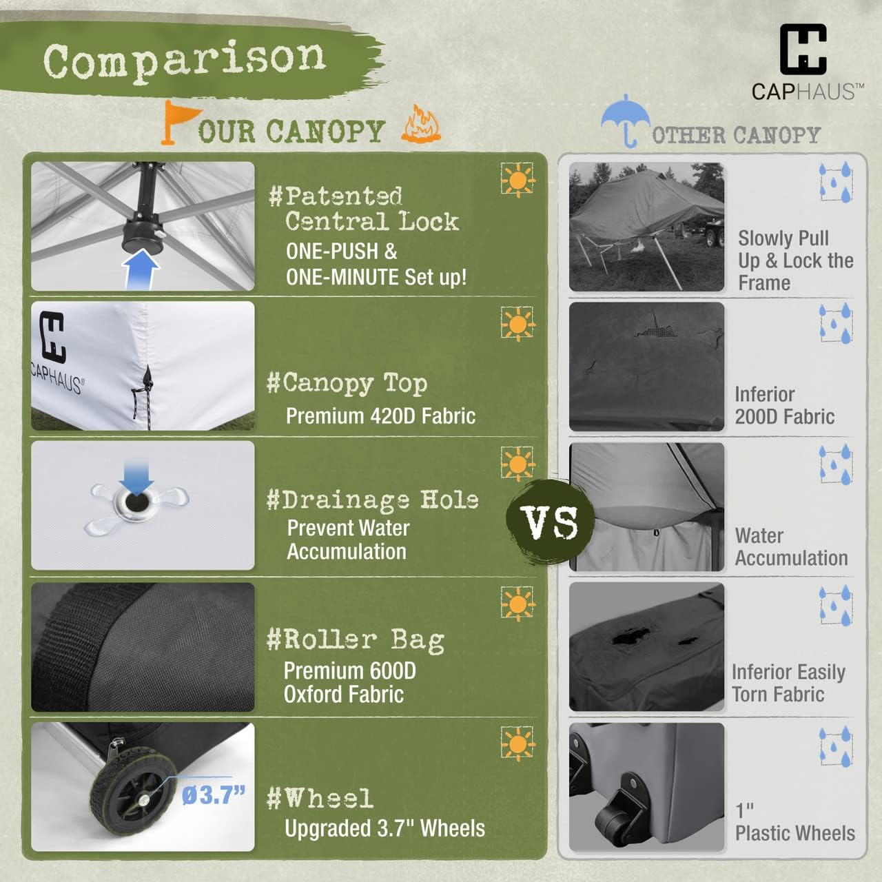 - Patented One-Push Set Up - Experience the easiest set up with the CAPHAUS ez up canopy! Our patented one-push center lock technology allows you to lock out all four legs with a single push, while the soft pinch-free buttons let you adjust the leg height from 3ft 4β to 6ft 4β without any hassle. Don't settle for complicated canopies β choose CAPHAUS and set up your shelter effortlessly!