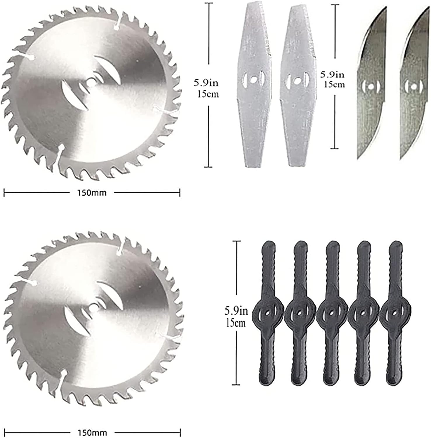 - 【3Types Blades】:Package come with 3types blade,Plastic blades work like heavy duty string, which is great for soft grass. Metal blades work like a miniature lawn mower blade and cuts through weeds,lawns and small branches. Manganese steel round saw blades for cutting thicker brushes and branches.After using blade, please put back in the original packaging(with oil inside) to save, which can extend the service life of the blade.Tips:please don't use plastic blades to mow thick shrub branches.