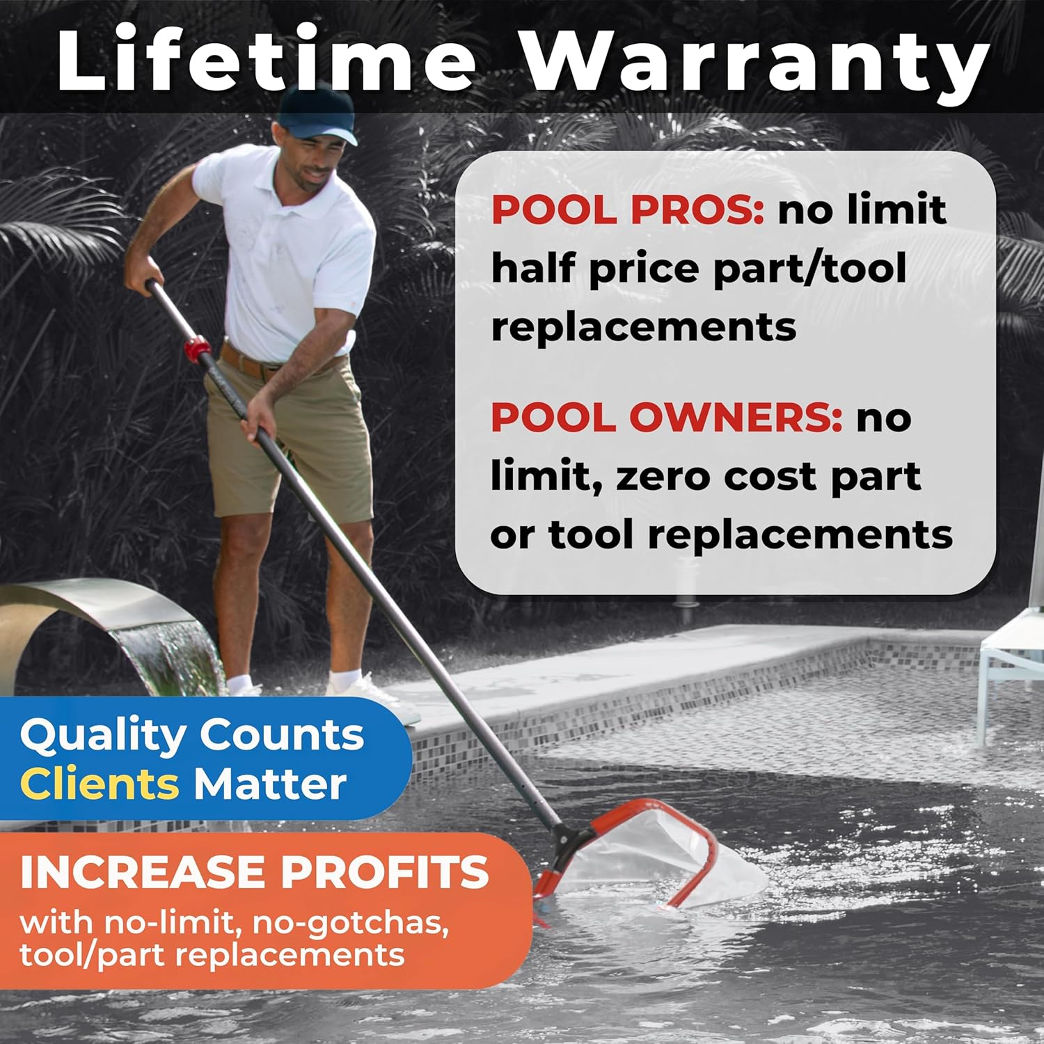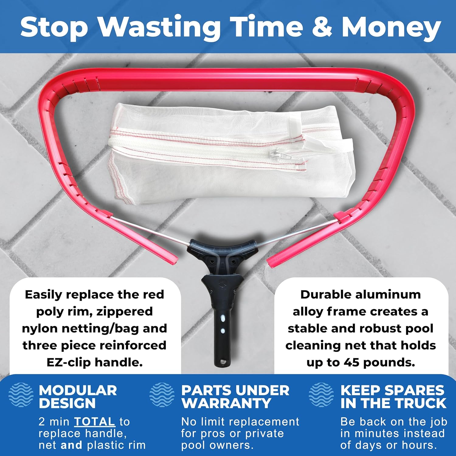 - NEARLY ELIMINATE DOWNTIME DUE TO BROKEN TOOLS - Keep an unlimited number of pool skimmer net part replacements (handles, nets, rims) in your truck (all at half off retail) for quick and easy on-site tool repairs. Stay on the job, making money and working hard for your clients.