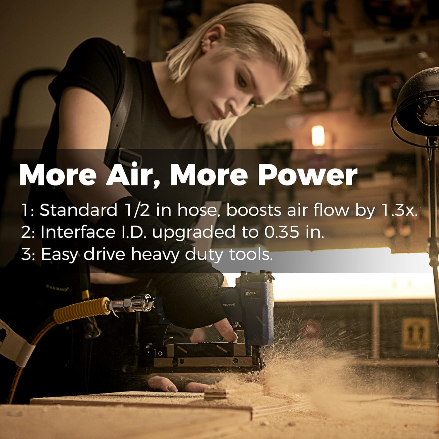 - High Flow 1/2" Hose and 5 Ft Extension Lead: Premium hybrid hose maintains all-weather flexibility (-13 to 113 Β°F). 0.3 in double-layer hose wall withstands up to Max 300 PSI so it won't kink, flatten, expand and crack under pressure. Swivel brass connectors allow for easy installation, and the orifice expands to 0.35 in which provides 1.3 times the airflow of 3/8 in hose to easily drive heavy tools.