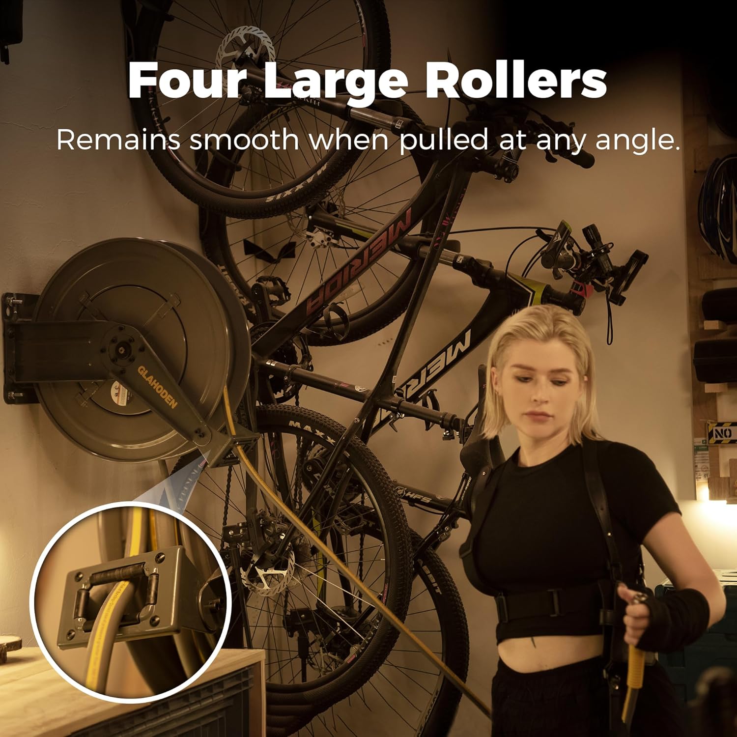 - Solid and Smooth Ratcheting System: Constructed from 1045 high carbon steel, the 12-position ratchet gear lock offers improved strength, lifespan, and abrasion resistance, which locks precisely to the desired length when you hear the "click". Four hefty rollers keep the retractable air hose smooth when pulled at any angle (the roller bracket can be adjusted for angle with 6 screws).