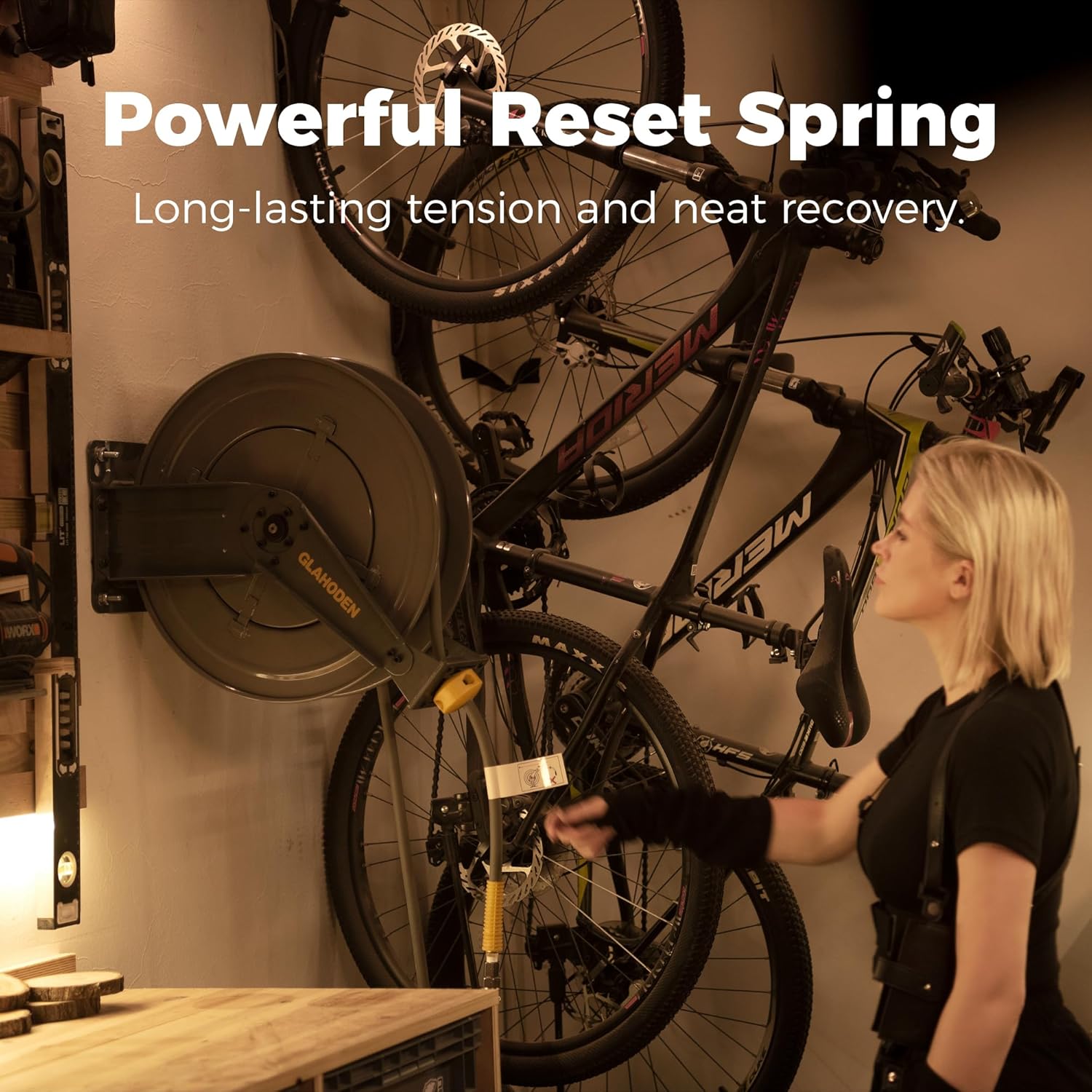 - Strong and Tangle-free Retraction: GLAHODEN retractable air hose reel uses a more powerful retracting spring, which maintains good tension even though it has been released recurrently 10,000 times. Self-leveling system winds the hose evenly, neatly and tangle-free, so that you say goodbye to "messy" workplaces from now on.