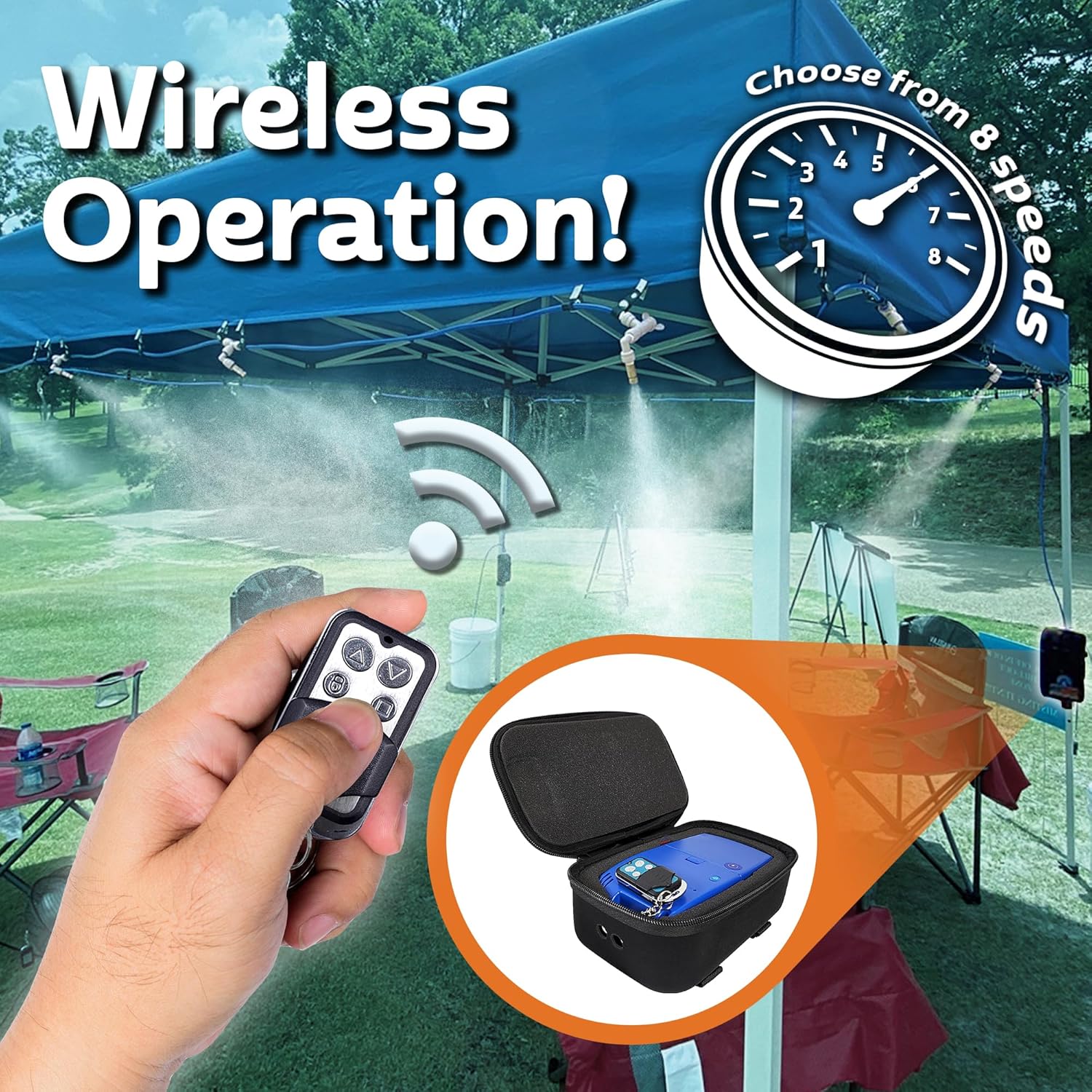 - ππππππππππ ππππππππ - Perfect for situations where a/c outlets and garden hoses are not an option, the Quad kit features a convenient wireless remote! Simply insert the 4 ft. feed (1.2 m) hose into any clean water source, set the speed and enjoy the cooling mist! A single charge lasts approximately 5-12 hours of refreshing mist with each use.