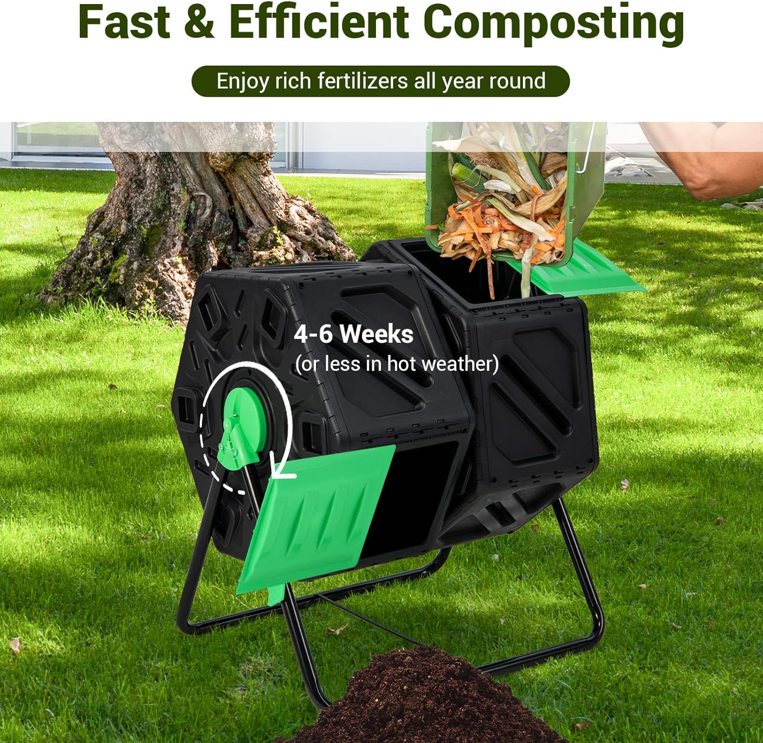 - 【360° Rotatable Design】2 chambers can be separately rotated 360°, which can speed up the composting process and there is no need to dig or mix the pile by hand. And it can be easily locked by side buckles. The rotating design is also convenient to pull out fertilizer.
