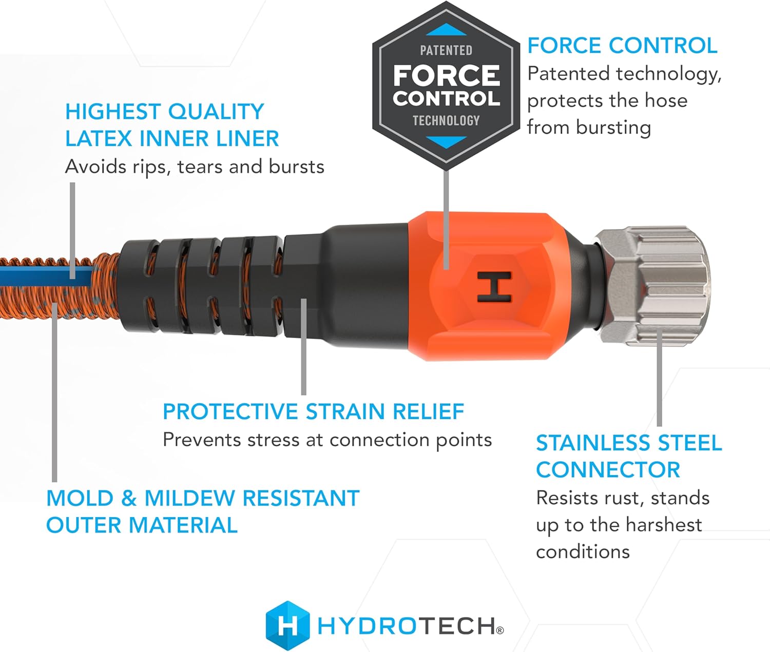 - STRAIN RELIEF GUARD: creates support from the connector to the garden hose, extending bend radius and stability