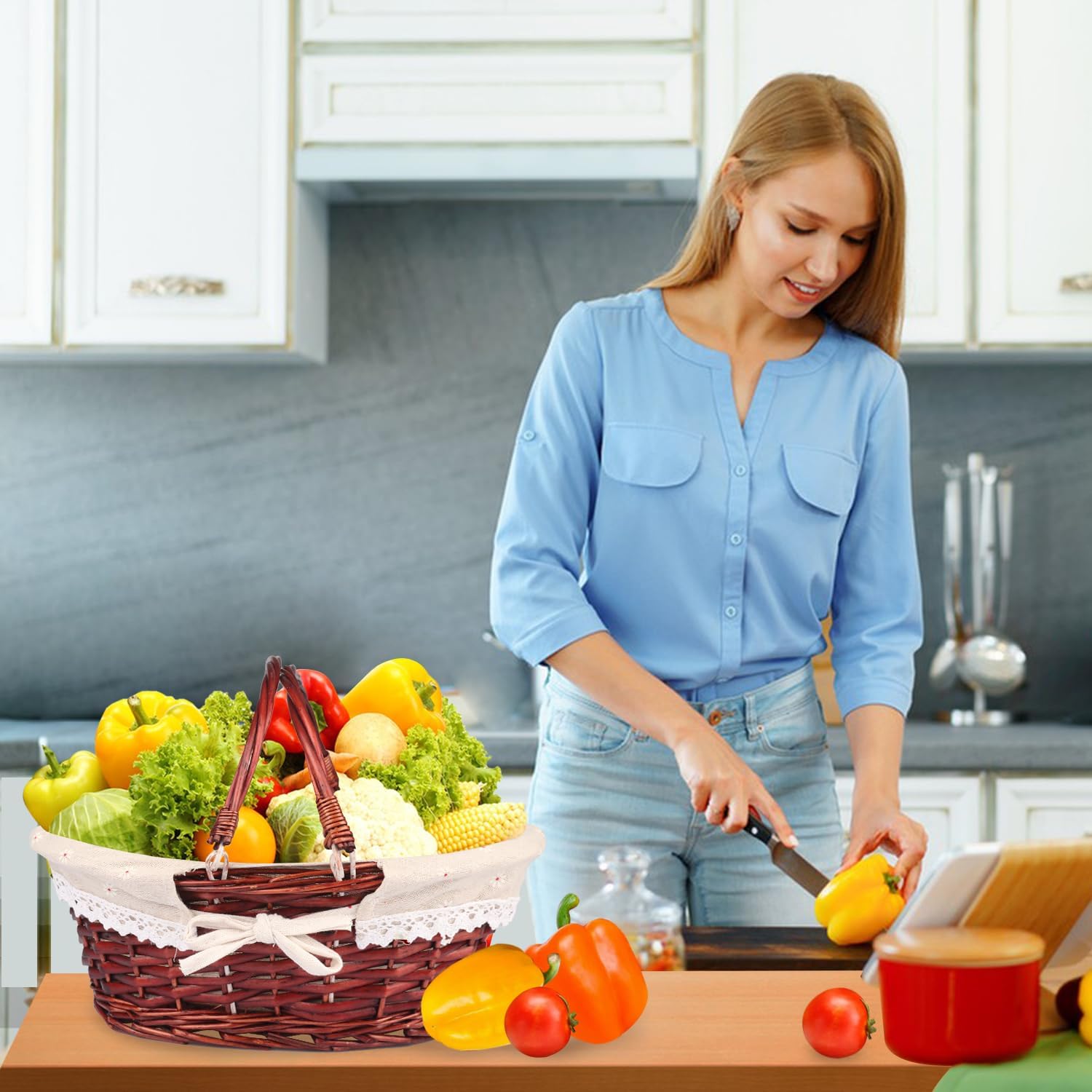 - 【Multiple Uses】These Willow Basket with Handle can be used for various purposes, including storage of clothing, accessories, fruits, vegetables, snacks, and more. They can also be used as decorative pieces in homes, offices, hotels, and other places.