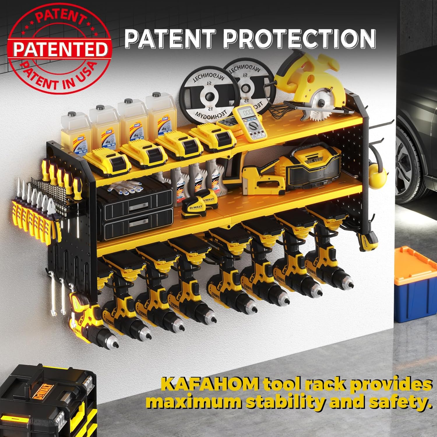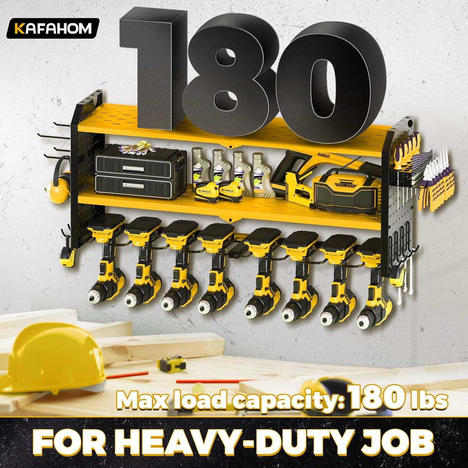- STRUCTURAL OPTIMIZATION: The KAFAHOM top-of-the-line garage organization rack features a revolutionary structure design that provides exceptional stability and increased weight capacity for your power tools. Thanks to the optimized structural design and aspect ratio - not only is it can perfect for the 16" wall studs, but the utility cordless drill holder can be mounted on concrete, drywall, pegboard. Plus, the lower part can hold up to 8 heavy power tools.