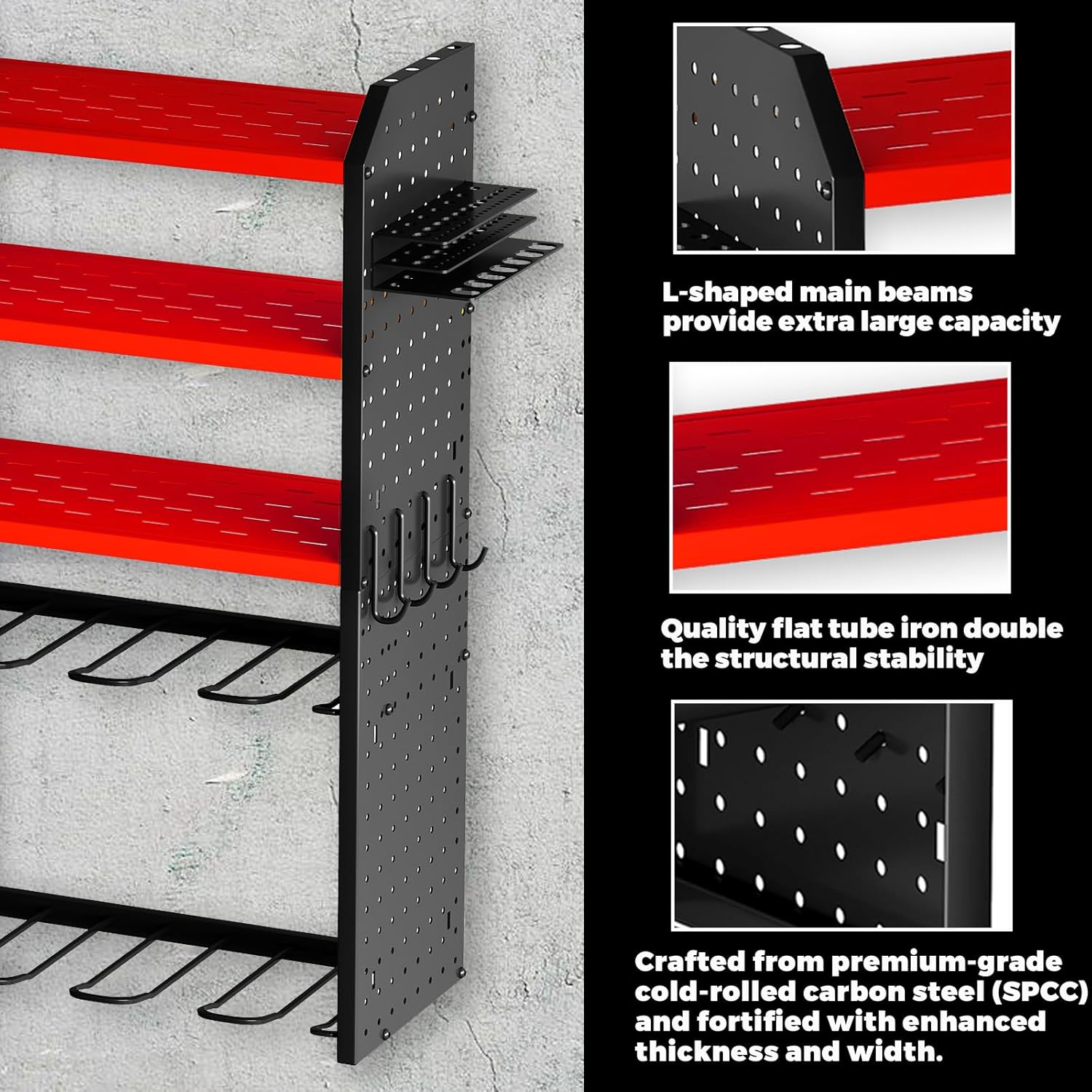 - EXTRA SPACE: Besides the main body of the KAFAHOM garage wall shelving, we add more to accommodate the small parts to handle the mess and clutter. An extra side rack can hold over 30 drill bits in different sizes and styles and be a clean space for every handy stick-shaped tool like screwdrivers, pry bars, glue applicators, Etc.Amazing Christmas or father's day gift for men.