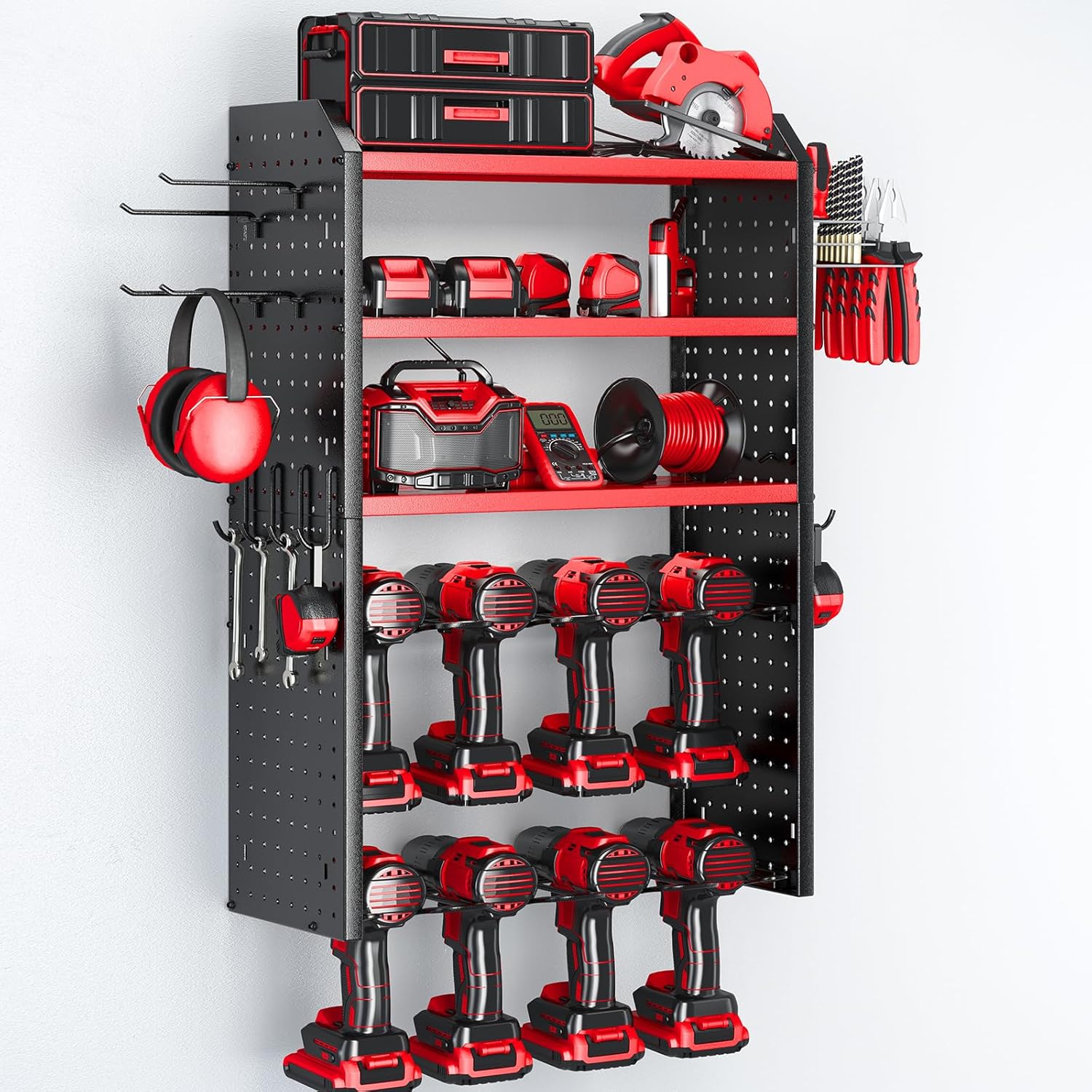 KAFAHOM Power Tool Organizer, Large 8 Drill Holder Wall Mount with 2 Side Pegboards,5 Layer Heavy Duty Metal Tool Storage Rack, Tool Shelf for Garage Organization, Utility Battery Shelves - Red