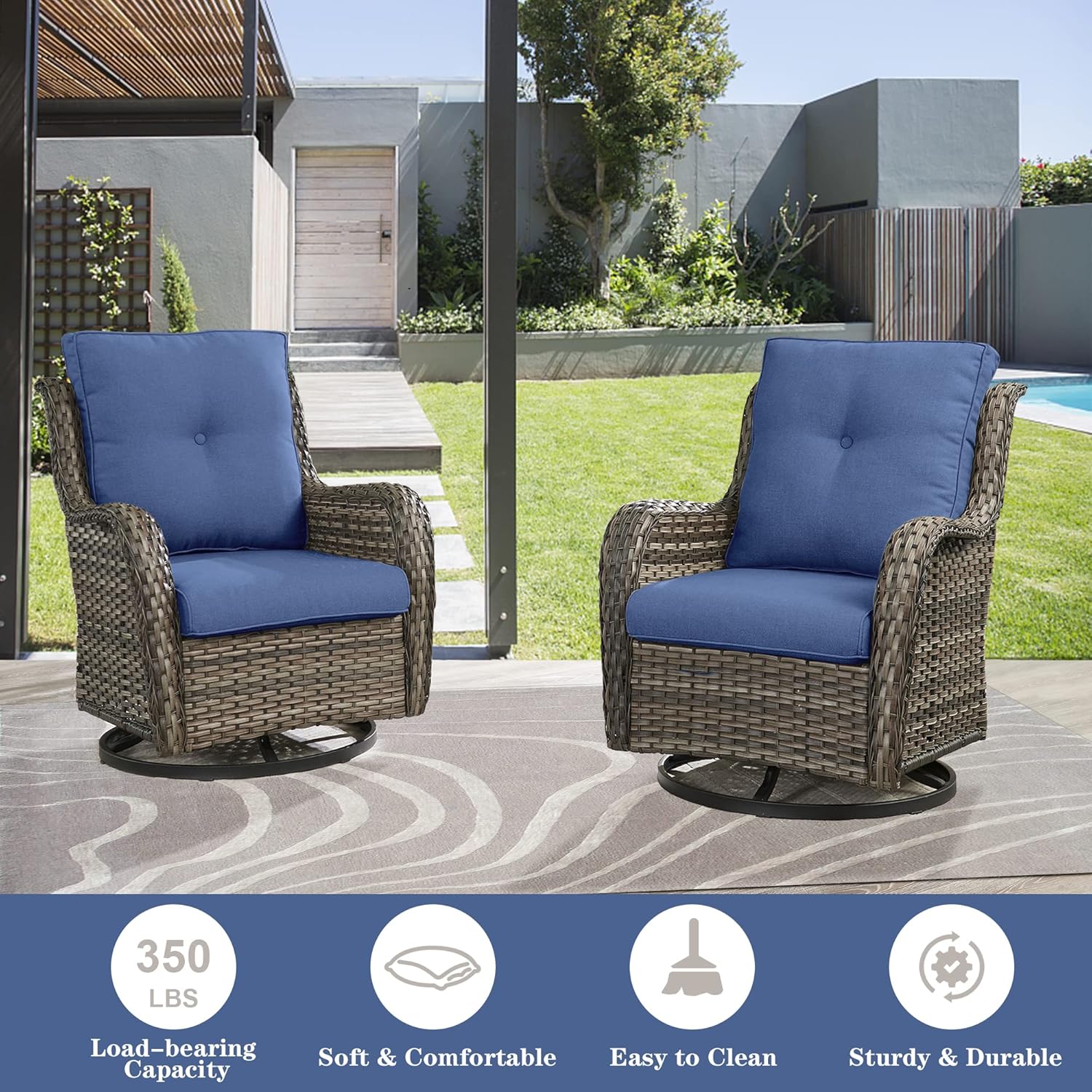 - 【Marvelous Design Wicker Swivel Rocker】 The base of the outdoor swivel rocker chair is a dual-function round base that can rotate 360 degrees and also glide back and forth. The rocking design helps you sit more easily and comfortably, with a non-slip pad added to the base, the operation will be smooth and stable, and you don't have to worry about the wicker chairs tipping backwards at all.