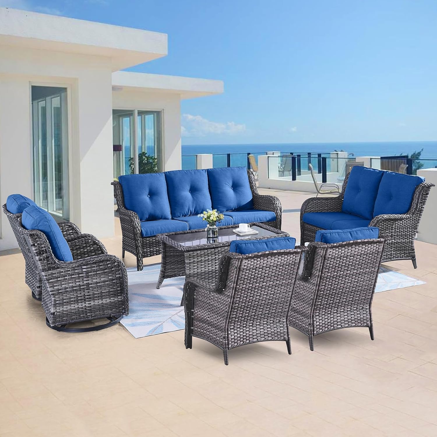 - 【7 PC Patio Furniture Set】 The 7-piece patio furniture set includes 2 outdoor swivel glider chairs, 2 outdoor wicker club chairs, 1 outdoor wicker sofa, 1 wicker loveseat and 1 glass top coffee table, patio ottoman can not only be used to relax your legs, but also can be used as a small table or small stool. The oversized wicker swivel chairs can hold up to 350 pounds.