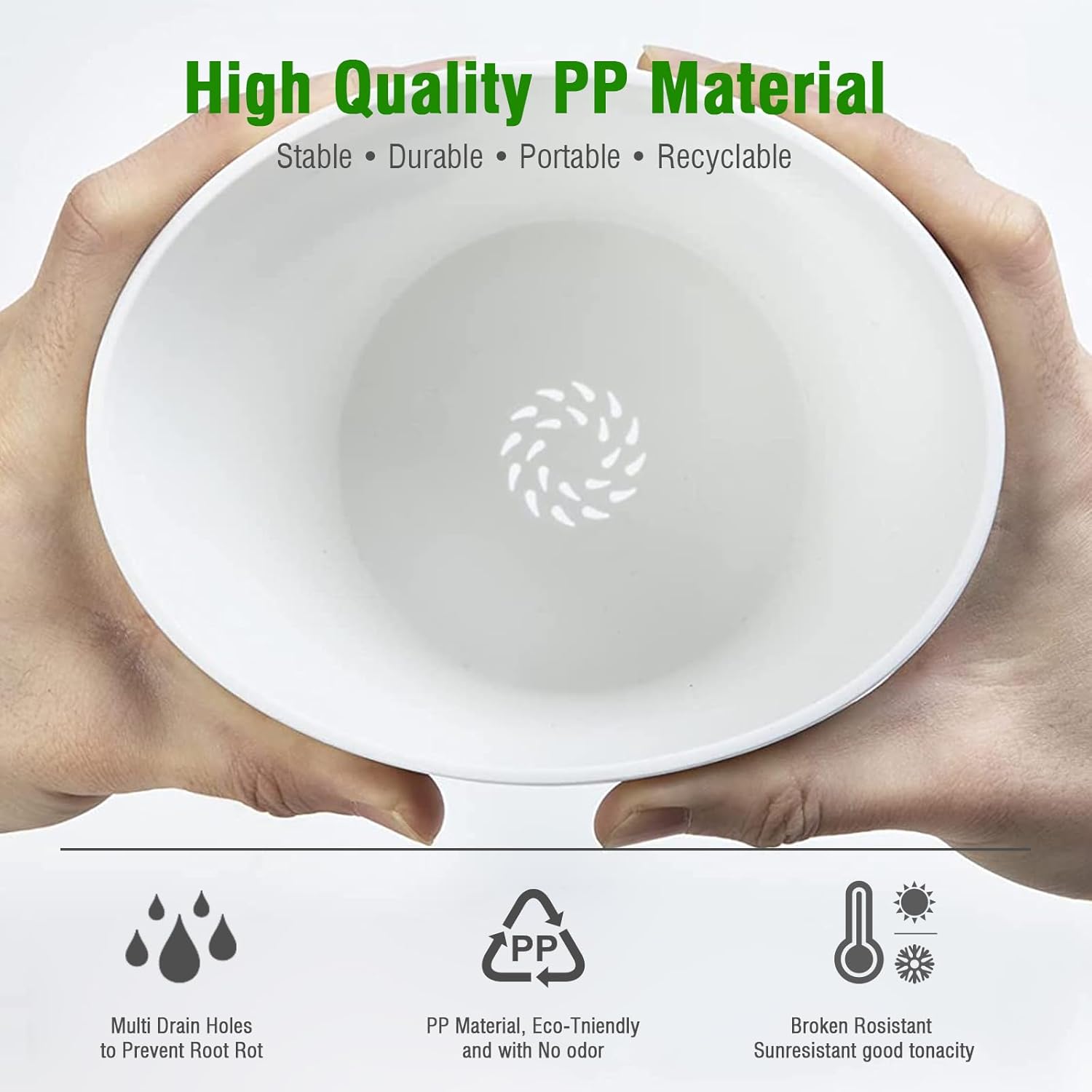- DROP-SHAPED DRAINAGE HOLES & REMOVABLE SAUCER - Each flower pot have 20 drainage holes at the bottom that help to drain excess water effectively and quickly, but the drop-shaped holes can be prevent the soil from draining with the water. Also prevent house plants overwatering.