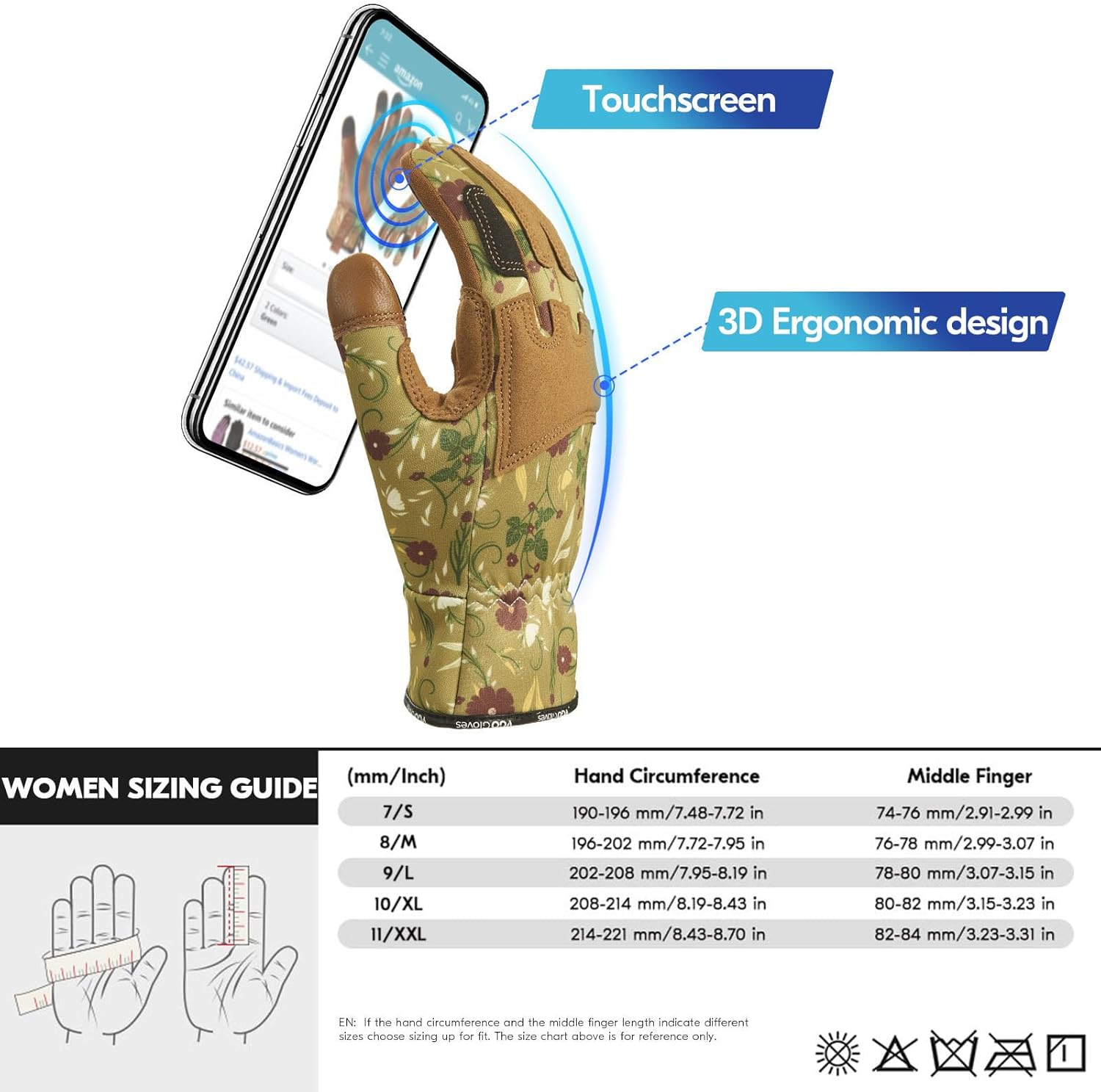 - ERGONOMIC WOMEN SIZE & TOUCHSCREEN COMPATIBLE - Designed specifically to fit a Women's hand with 45Β° angle cut at the finger junctions and pre-curved fingers ensure a tailored fit with flexibility, breathability & comfort. Hook & loop closure for better adjustment. Touchscreen capable thumb & index fingertips for smartphone control.