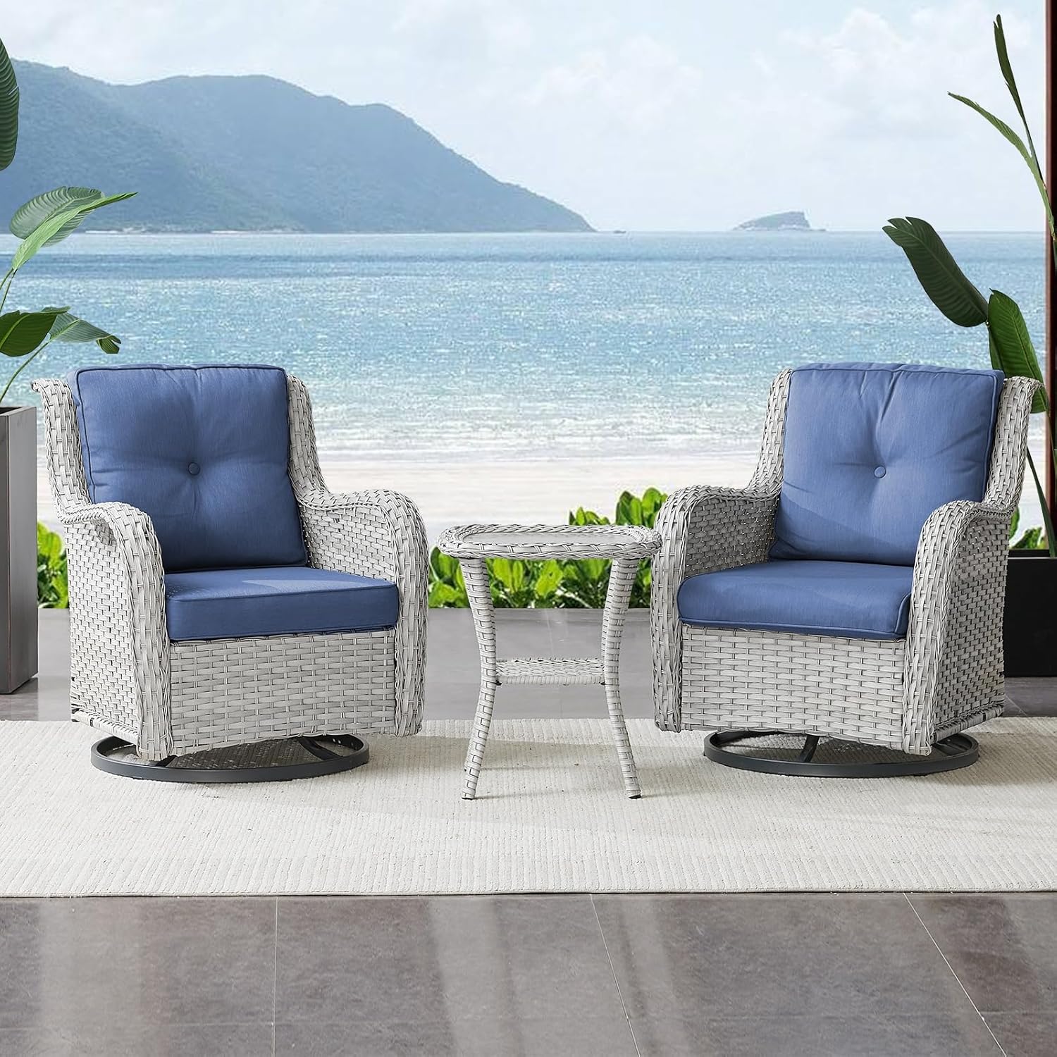Outdoor Swivel Rocker Patio Chairs Set of 3,High Back Swivel Patio Chairs Wicker Furniture Set,2 PCS Rattan Swivel Rocking Chair with Side Table,Light Grey Wicker (A089-2)