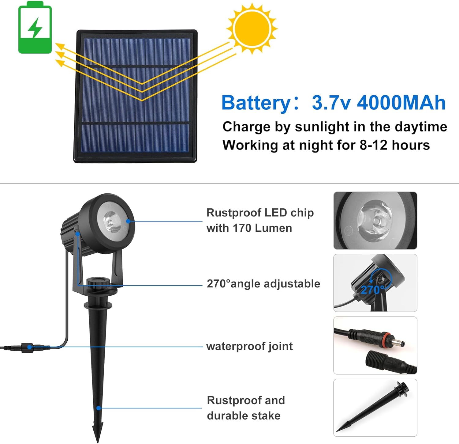 - 2-IN-1 Installation: Solar panel and lights can be mounted on the ground or on the wall with the included screws. Each spotlight comes with 118 inches/3m cable, which can be freely adjusted up and down by 270Β° to meet different requirements