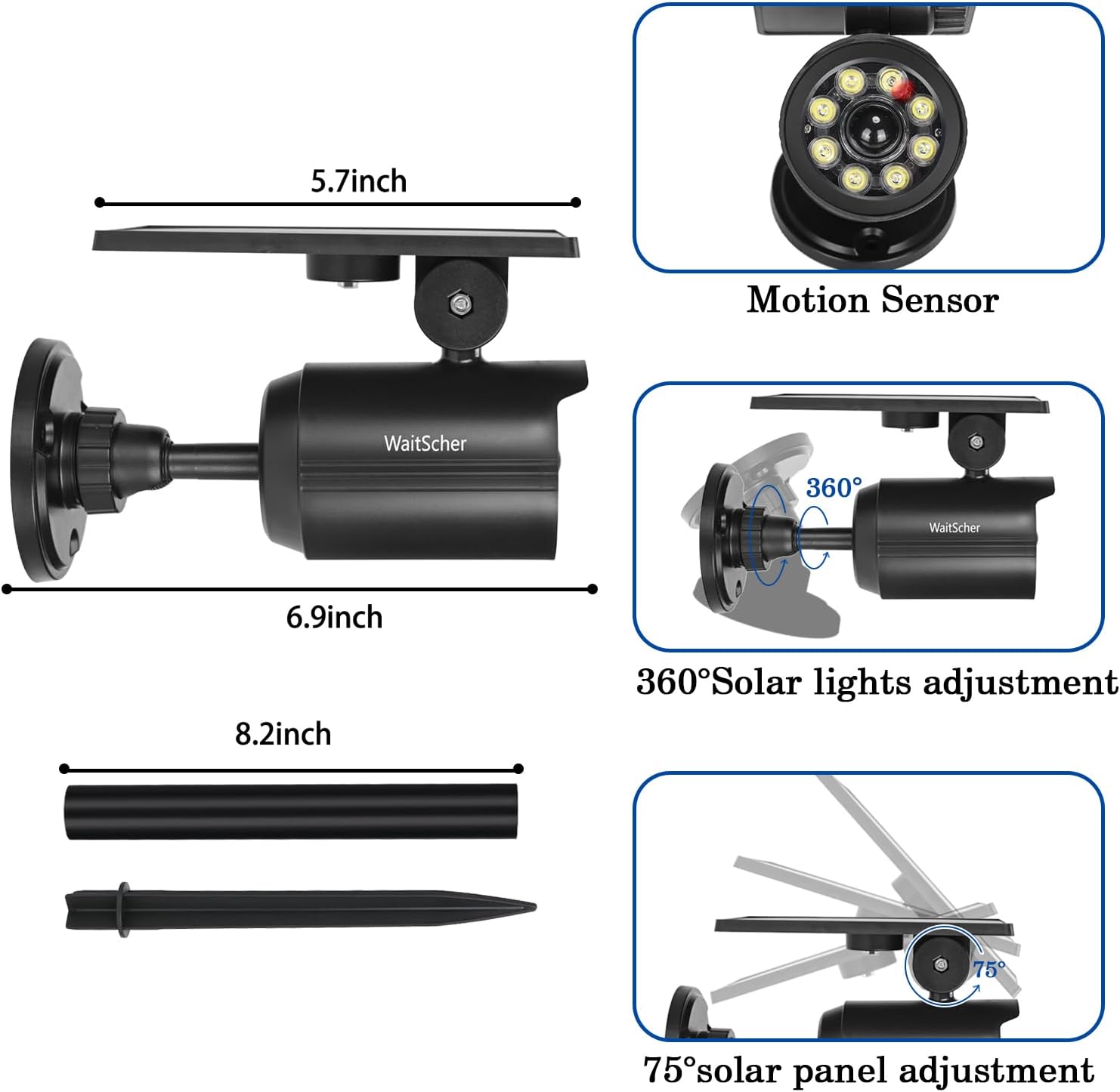 - Solar Motion Lights with Fake Security Camera: A dummy fake security camera with a red indicator light is almost as useful as a real one in deterring burglars and intruders but at a much lower cost, solar flood lights outdoor providing secure illumination and protection for the dark corner of your house, especially for those who live alone