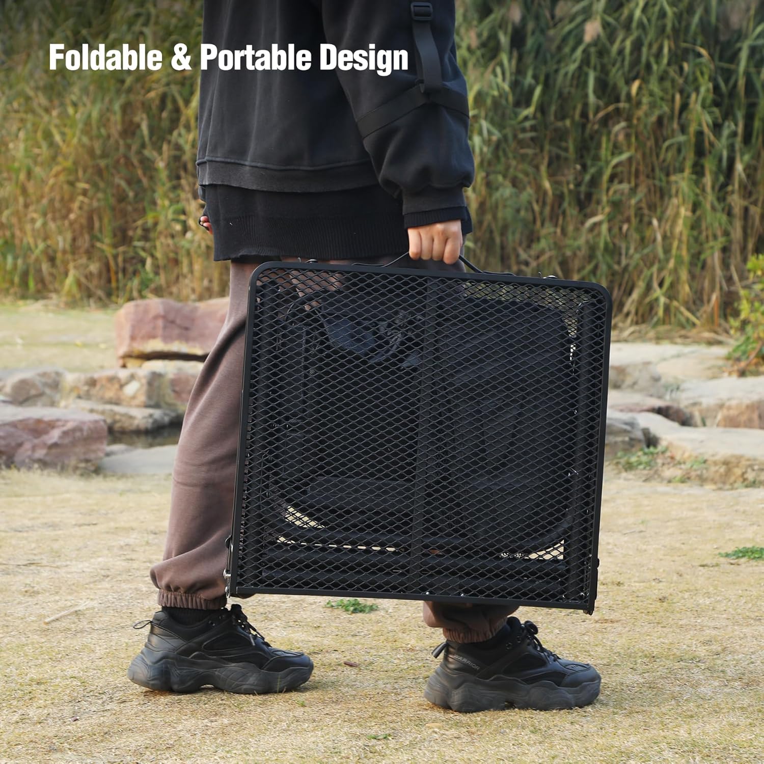 - Superior Material: The tabletop of this folding grill table is made of powder coated iron mesh, wear-resistant, high-temperature resistant, and can be used for a long time. Its framework is supported by Ο25mm aluminum alloy tubes, which is stable enough and can hold up to 66lbs/30kg. The feet with cover can effectively prevent from slipping.